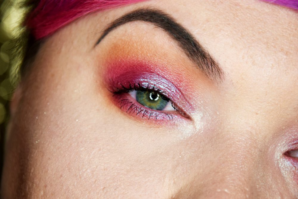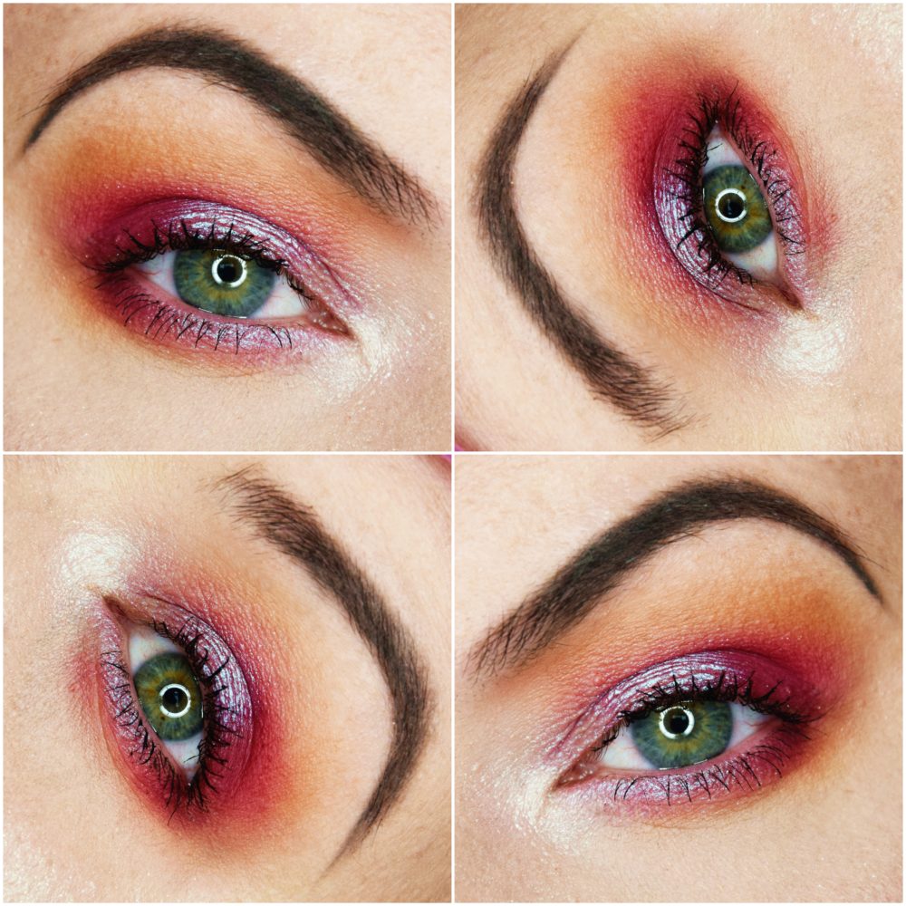 Sięgam najpierw po paletę KOBO Over The Rainbow. Nią wykonturuję oko. W załamaniu ląduje odcień lekkiej pomarańczy (cień nr 66), a kolejno pogłębiam i wzmacniam je czerwienią (cień nr 67). Czas na bordo, które trafia na zewnętrzny kącik. Resztę powieki ruchomej pokrywam duochromem/benzynką (cień Garden Gate z palety Nabla Soul Blooming). Podobne cieniowanie powtarzam analogicznie na dolnej powiece. Na końcu rozświetlam wewnętrzny kącik (cień Philosophy z palety Nabla Soul Blooming).