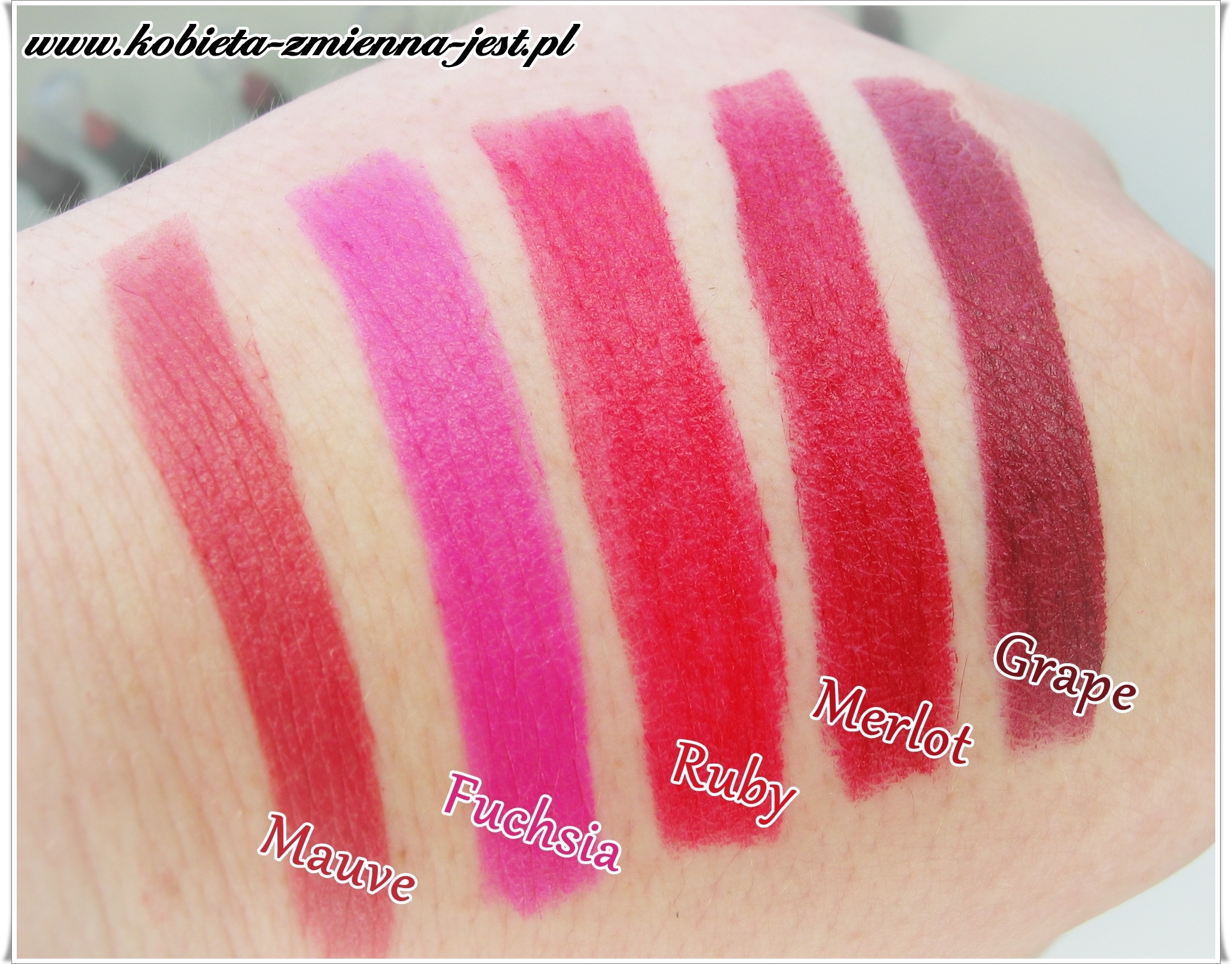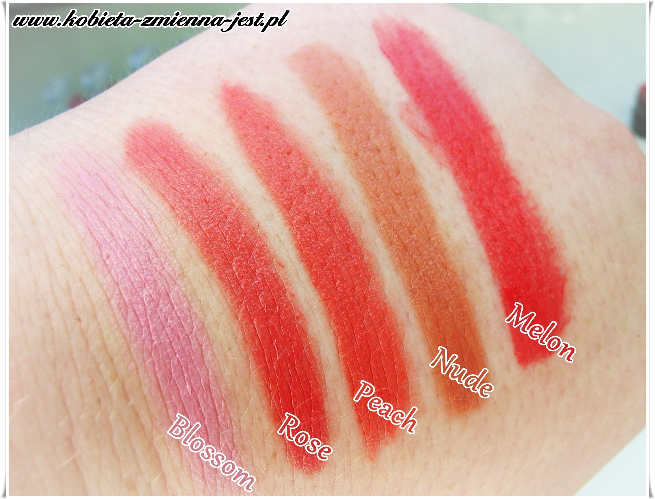 Moimi osobistymi faworytami są Fuchsia i Ruby. Grape mnie kusi, ale jesienną porą. Blossom wygląda na dość „tandetną”, ale nałożona z umiarem (do zobaczenia TUTAJ) wygląda całkiem fajnie. Melon wygląda soczyście na lato.