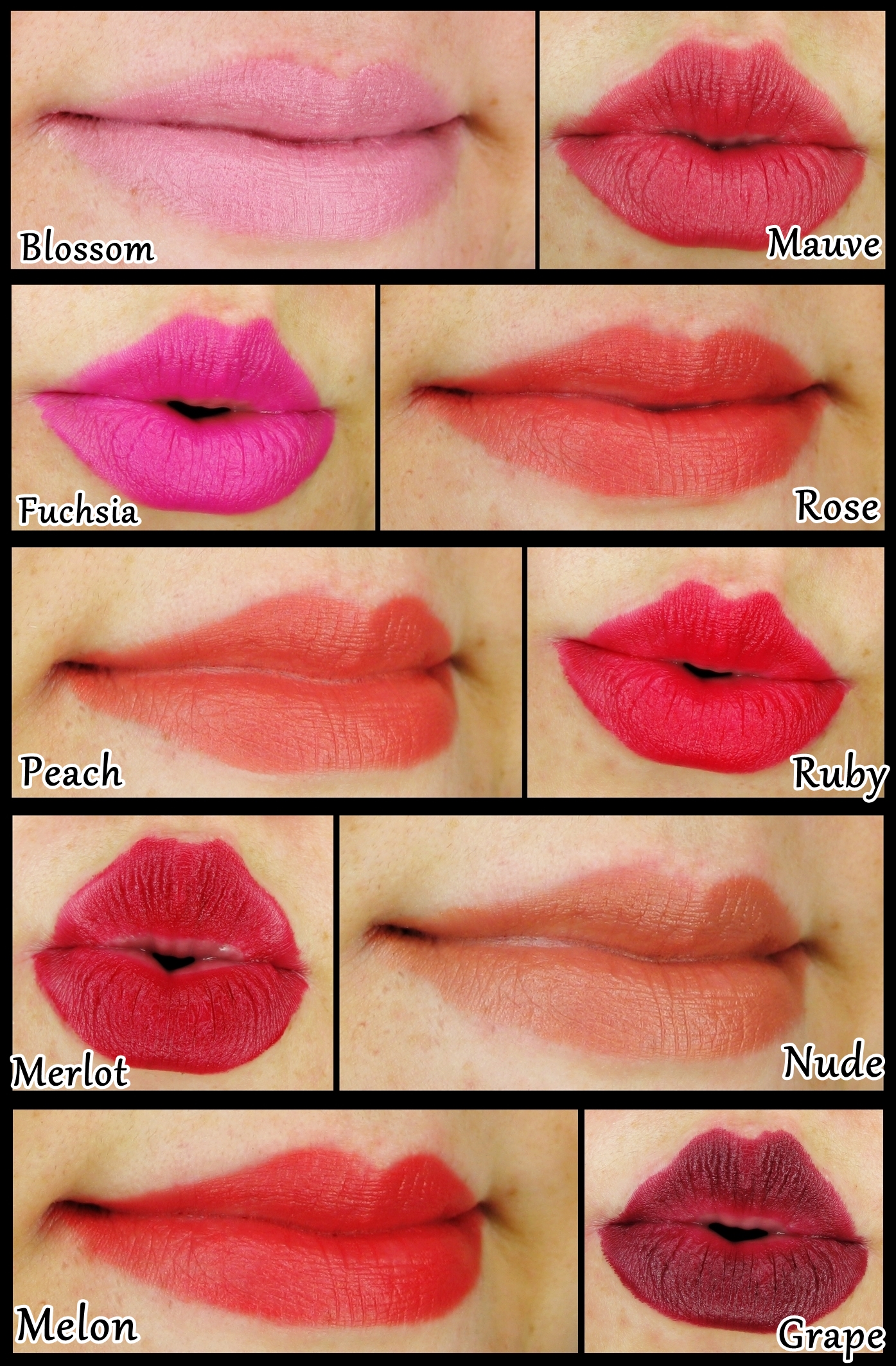 Wersja matowa szminki Ultra Colour liczy sobie 10 odcieni: Blossom, Grape, Fuchsia, Mauve,Melon,Merlot, Nude, Peach, Rose, Ruby.