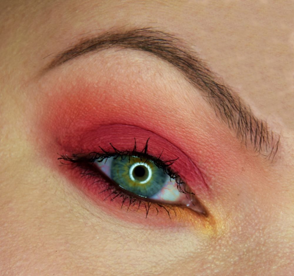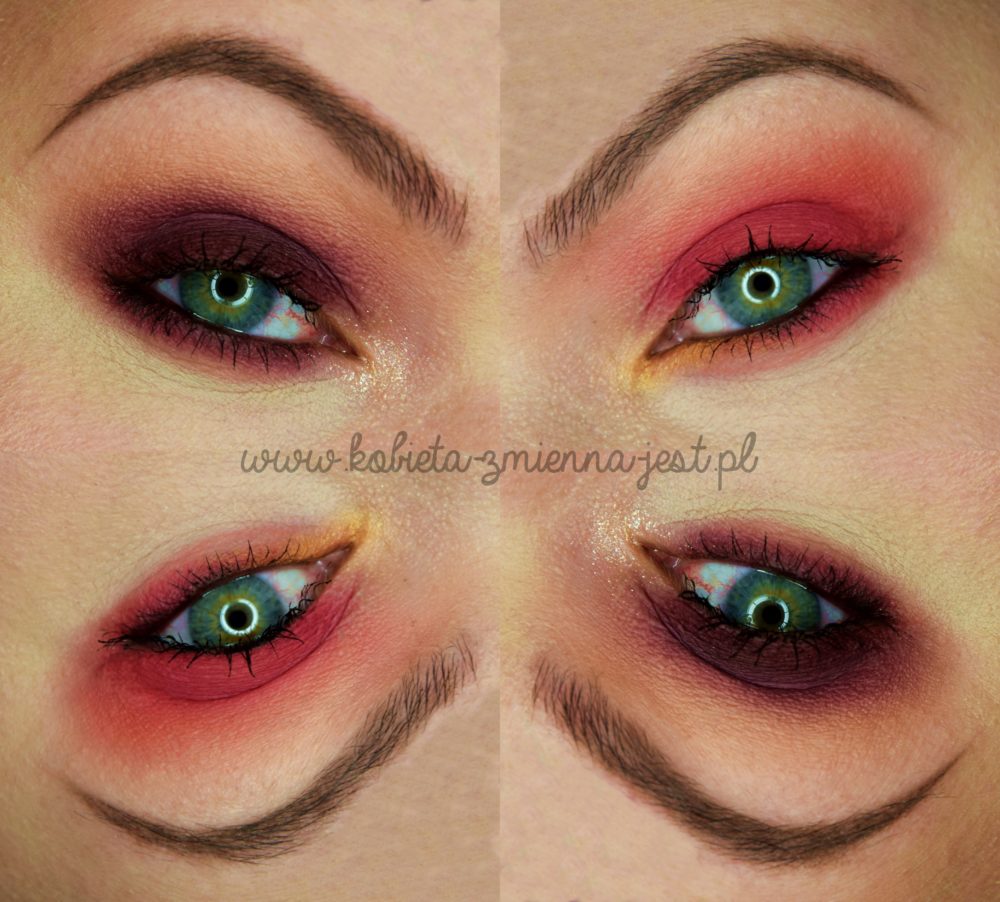 Użyłam: GlamShadows: matowy cielak (pod brwią), paprykarz (załamanie), dzika malina (powieka), blada brzoskwinia (kolor przejściowy do roztarcia), bursztynek, bursztynek (wewnętrzna dolna powieka), złoty piasek (wewnętrzny kącik).