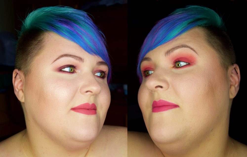 Użyłam: GlamShadows: matowy cielak (pod brwią), słodkie kakao (załamanie), coca cola (powieka), blada brzoskwinia (kolor przejściowy do roztarcia), folia Makeup Revolution Rose Gold (wewnętrzny kącik).
