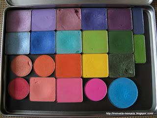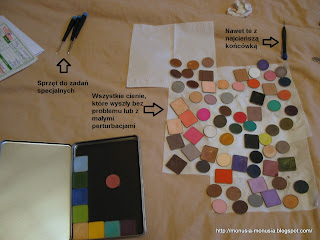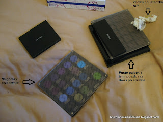 Deponowanie cieni z palety starego typu (tej z okienkami) było bardzo proste ponieważ jest bardzo łatwy dostęp do cieni, z paletą 20-stką na cienie prostokątne też poszło szybko bo akurat w okienkach na cienie prostokątne jest więcej luzu między cieniem a okienkiem. Najgorsze były 20-stki na cienie okrągłe, a miałam ich dwie czyli 40 cieni do wyjmowania.