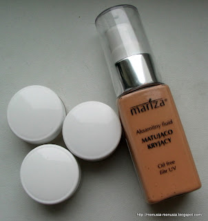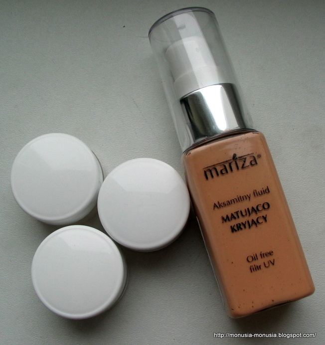 Pełnowymiarowe opakowanie Aksamitnego Fluidu Matująco-Kryjącego (cena katalogowa 14,90 zł) oraz próbki Podkładu Balansującego z serii Mariza Selective (cena katalogowa 27,90 zł), Rozświetlającej bazy pod makijaż serii Mariza Selective (cena katalogowa 28,80 zł) oraz Krem Oliwka z oliwek Krem Regenerujący z serii Naturalne Ekstrakty (cena katalogowa 12,40 zł)