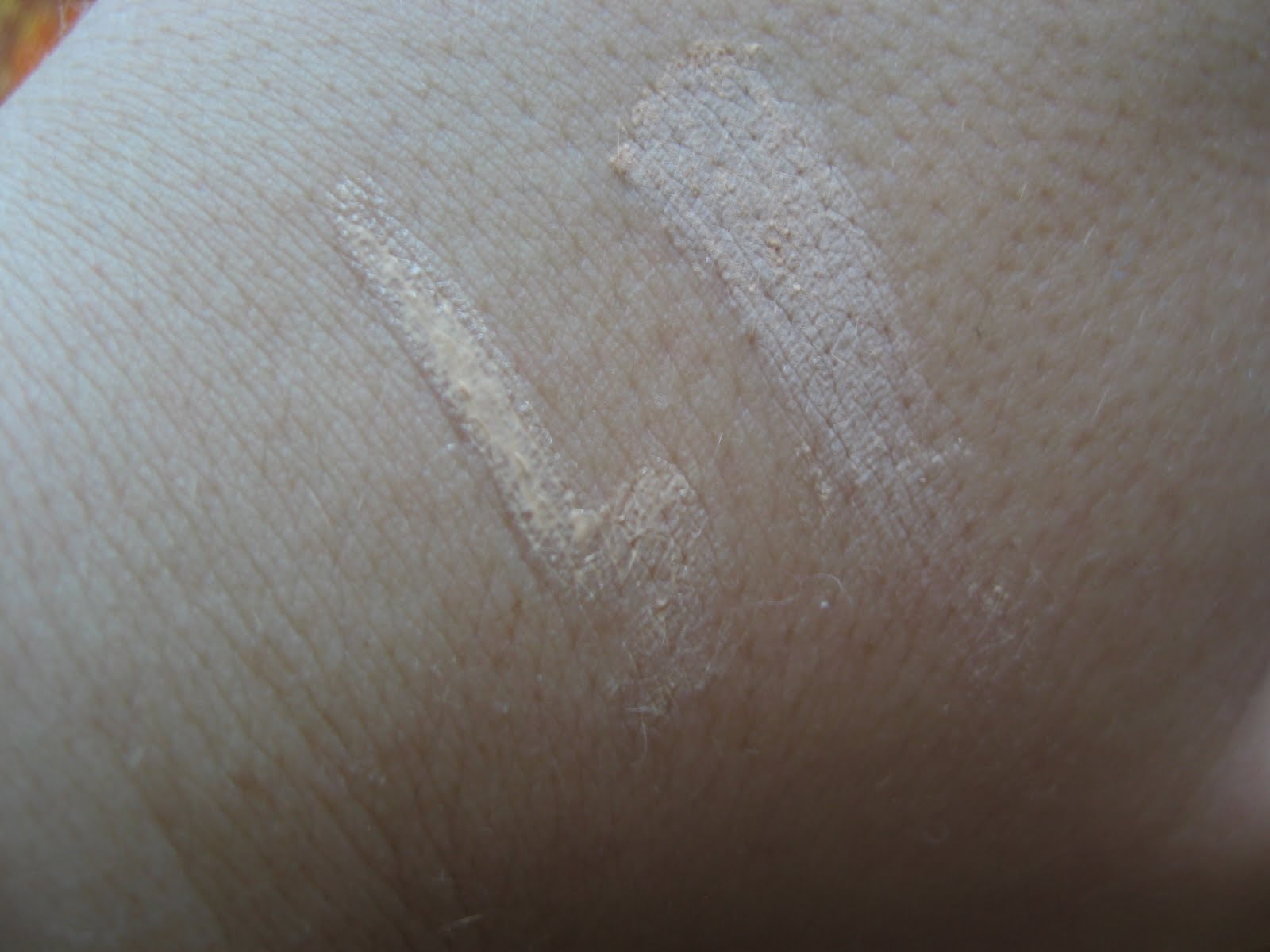 | Po prawej krem koloryzujący a po lewej podkład mineralny |