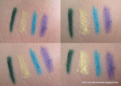 Kredeczki Satin Touch Kohl już od dawna były na mojej liście „must have” a w oko wpadły mi właśnie te 3 kolory, a że w ofercie My Secret nie ma fioletu (a to mój naj naj najbardziej ulubiony kolor) to przygarnęłam automatyczną kredkę z Essence. Kredki są super miękkie i mam nadzieje, że trwałe, a do tego w pięknych żywych kolorach.