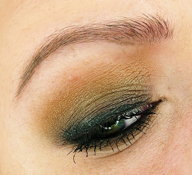 Na całą powiekę ruchomą nakładam bazę w kolorze szarego brązu (Maybelline Color Tattoo 24HR #40 Pernament Taupe). Następnie sięgam po paletkę Sleek Au Naturel i wybieram cień Moss, który jest brązem z domieszką zieleni. Nakładam go na całą powiekę i rozcieram w załamaniu uzyskując bardziej ciepły odcień. Dodatkowo wszystkie granice dymka rozcieram cielistym cieniem (paletka Sleek Au Naturel, cień Nougat). Kolejno wzdłuż górnej i dolnej linii rzęs rysuję kreskę (Avon SuperShock Gel Eyeliner Pencil #Black) i rozcieram czarnym cieniem (paletka Sleek Au Naturel, cień Noir). Na linię wody także nakładam czarną kredkę.