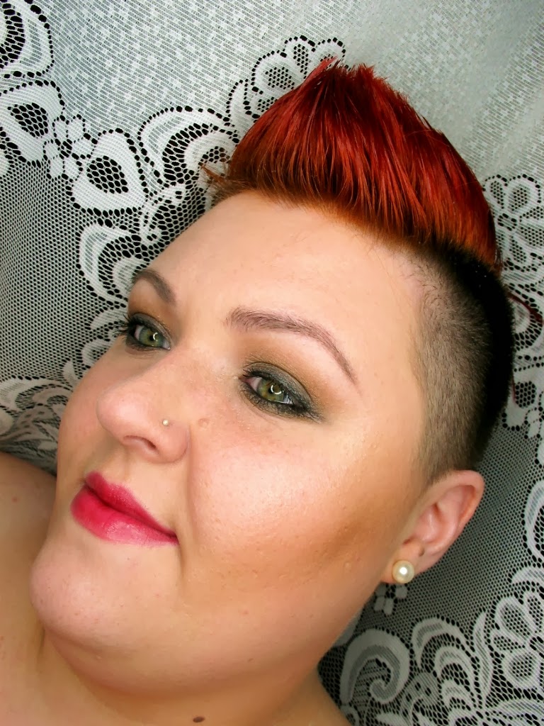 Pierwsze skrzypce w tym makijażu oczywiście grają usta, ale nie chciałam, żeby oczy zostały takie gołe… dlatego postawiłam na szybką i prostą wersję dymka nie w klasycznym brązie, a z lekką nutą zieleni.