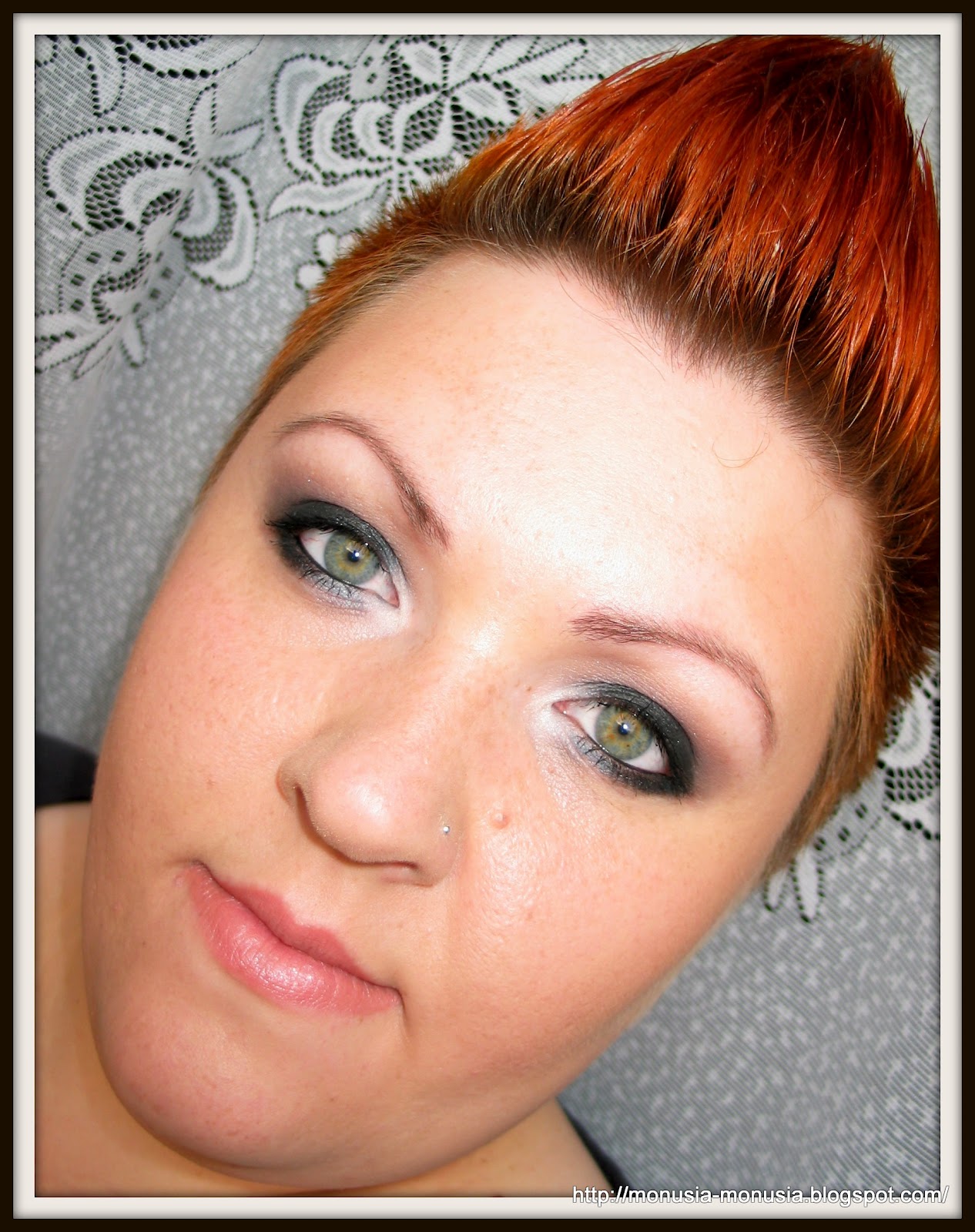 Żeby ta czerń nie była taka płaska i „czarna” użyłam cienia ze srebrnymi drobinkami… ale może zacznijmy od początku. Przy linii rzęs narysowałam kreskę czarną, miękką kredką ze srebrnymi drobinkami (Avon Glimmerstick Diamonds Black Ice) i roztarłam ją ku załamaniu tworząc w ten sposób bazę dla przyszłego cienia. Żeby kolor był najintensywniejszy przy linii rzęs, poprawiłam zarys kreski. Na bazę z kredki wklepałam w powiekę czarny cień ze srebrnymi drobinkami (Inglot 65 AMC). Aby utworzyć gradient kolorów od najciemniejszej linii rzęs aż po cielisty łuk brwiowy, czarny cień roztarłam w załamaniu jasnym brązem wpadającym w szarość/fiolet (Inglot 358 Matte). Wewnętrzy kącik rozświetliłam bielą ze srebrnymi drobinkami (Inglot 496 Double Sparkle), a na to nałożyłam jeszcze odrobinę białej perły (Inglot 453 Pearl). Pod łukiem brwiowym tylko cielisty mat (Inglot 353 Matte). Na linii wodnej czarna kredka (Avon SuperShock Gel Eyeliner Pencil).