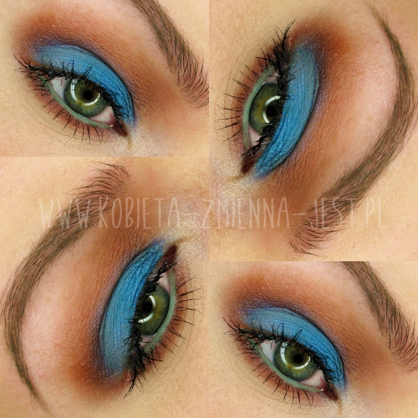 Zaczynam od podkreślenia załamania oraz dolnej powieki cieniem w kolorze terakoty (Zoeva Cocoa Blend Palette #Freshly Toasted). Następnie całą przestrzeń ruchomej powieki wypełniam matowym, jaskrawym błękitem (Inglot #371). Aby uzyskać delikatnie inny odcień oraz, aby wykończenie powieki było bardziej satynowe, na matowy błękit nakładam opalizujący (Inglot #159). Dodatkowo aplikuję odrobinę czekoladowego brązu (Zoeva Cocoa Blend Palette #Beans are white) w załamanie powieki, aby rozblendować błękit. Obszar pod brwią rozjaśniam cielistym matem (Zoeva Cocoa Blend Palette #Bitter Start), a wewnętrzne kąciki rozświetlam perlistym beżem (Wibo Diamond Illuminator). Dla ciekawego akcentu na linię wody nakładam miętową kredkę (Catrice Kohl Kajal #180 Too Cool for Pool).