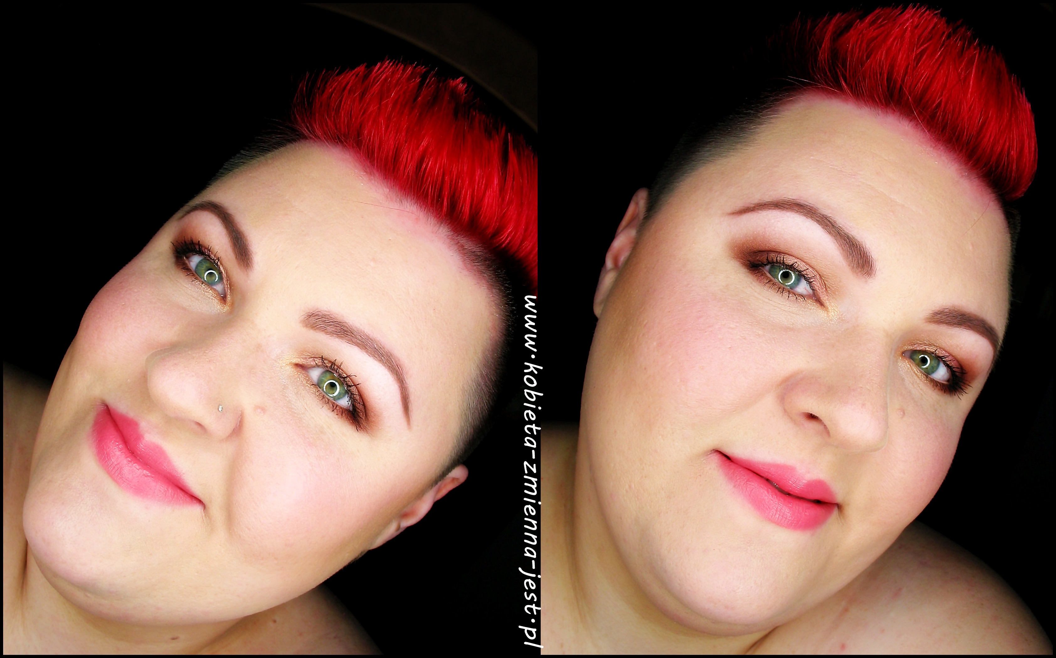 To jest zwykły dzienniaczek oparty na bardzo ciepłych barwach. 2/3 powieki ruchomej nakładam róż opalizujący na złoto (HEAN #512). Załamanie powieki delikatnie modeluje średnim brązem (Makeup Revolution Naked Chocolate Palette #Sweet Shop). Zewnętrzny kącik podkreślam czerwonym brązem (Makeup Revolution Naked Chocolate Palette #Choc-Fest). Wewnętrzny kącik w złocie (Makeup Revolution Naked Chocolate Palette #Double Dip) łączy wszystko w całość. Pod łukiem brwiowym nakładam cielistego nudziaka (Makeup Revolution Naked Chocolate Palette #Smoothly).