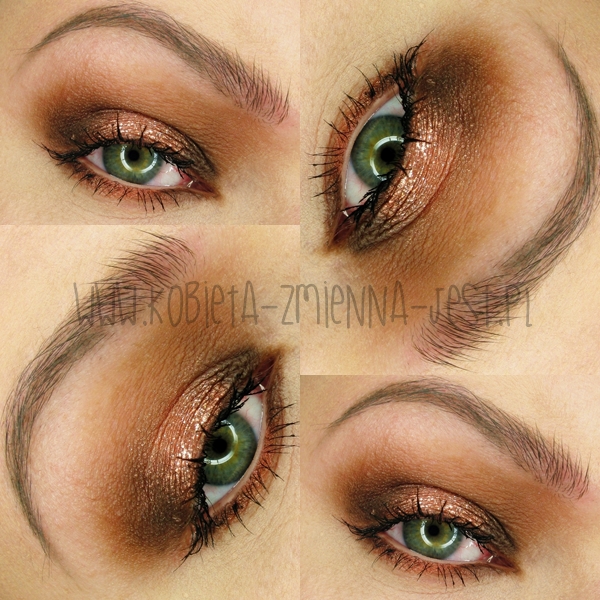Zaczynam od zaznaczenia załamania średnim, dosyć ciepłym brązem (Makeup Revolution Naked Chocolate Palette #Sweet Shop). Następnie „cieniuję” zewnętrzną i wewnętrzną część powieki czekoladowym, ciemnym brązem (Makeup Revolution I Heart Chocolate Palette #Stolen Chocolate), środek powieki pozostawiam „pusty”. Na tą pustą przestrzeń na środku aplikuję mocno połyskującą miedź (Makeup Revolution Affirmation Palette #Truth). Dolną powiekę cieniuję dokładnie w ten sam sposób. Granicę całości rozcieram cielistym matem (Makeup Revolution I Heart Chocolate Palette #You Need Love). Na sam koniec dla zintensyfikowania całości wklepuję palcem na sam środek powieki foliowy cień w kolorze złota (Makeup Revolution Awesome Metals Eye Foils #Rose Gold). Dla wyczyszczenia linii wodnej użyłam cielistej kredki (Max Factor Kohl Pencil #090 Natural Glaze).