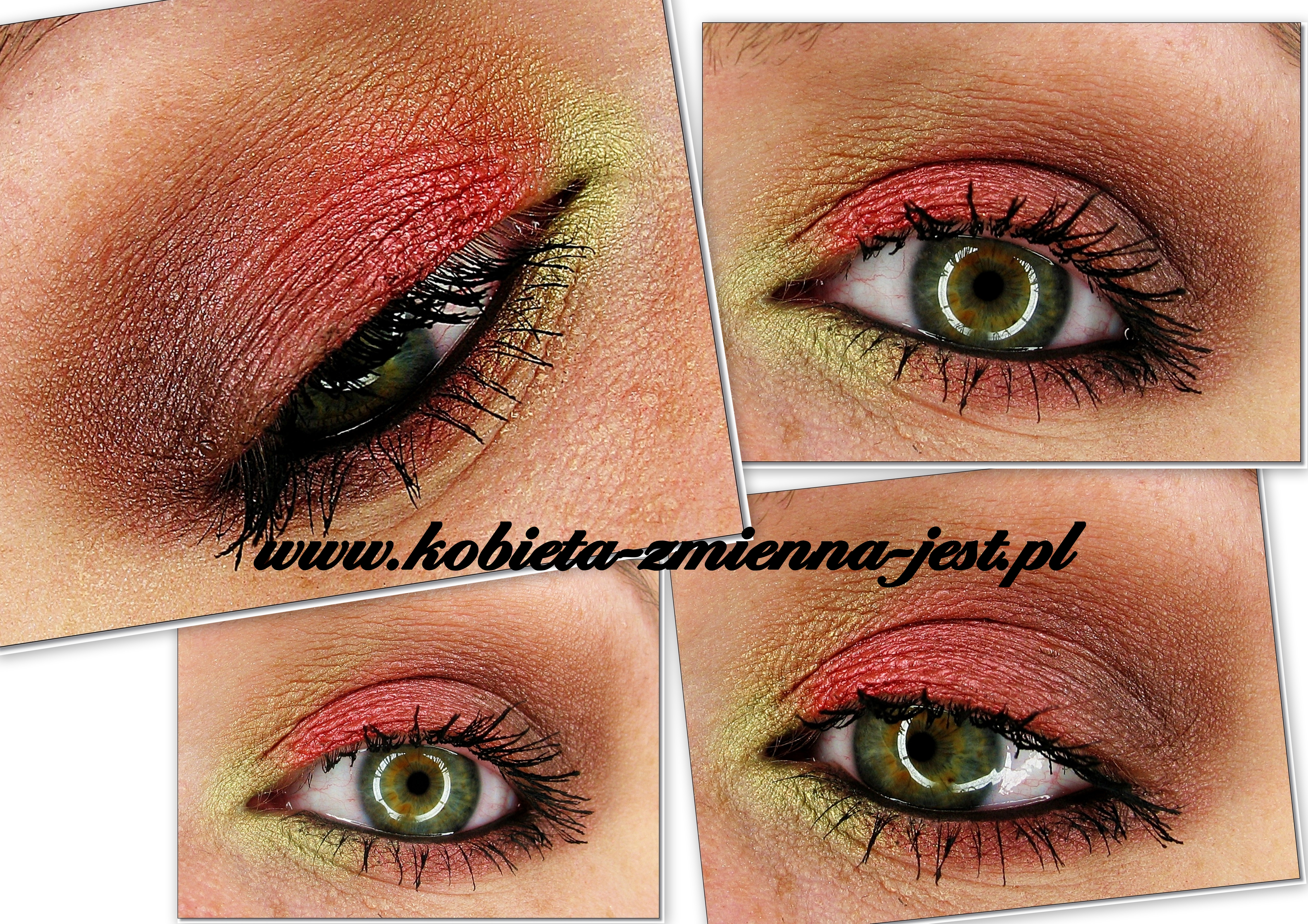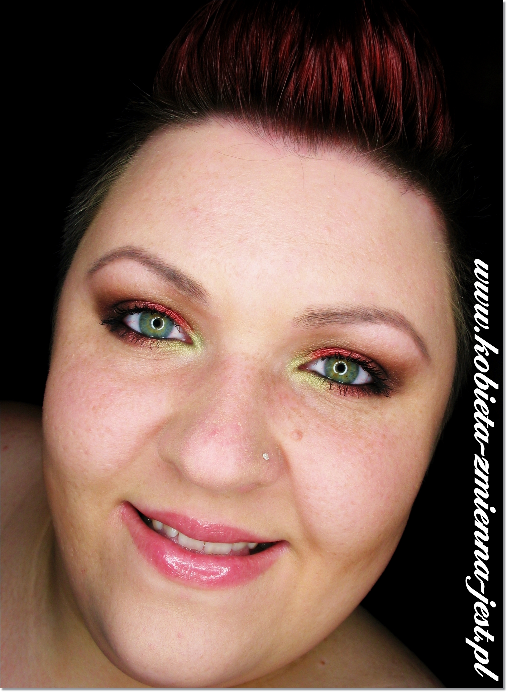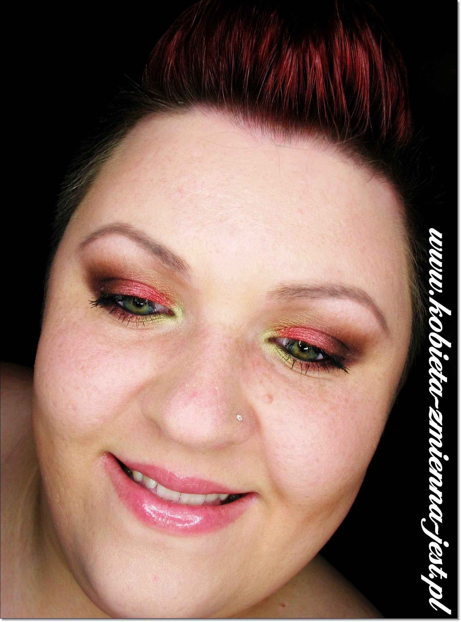 Dość prosty makijaż z czerwoną miedzią i bardzo ciepłymi brązami w tonacji czerwieni ochłodzony złotą zielenią.