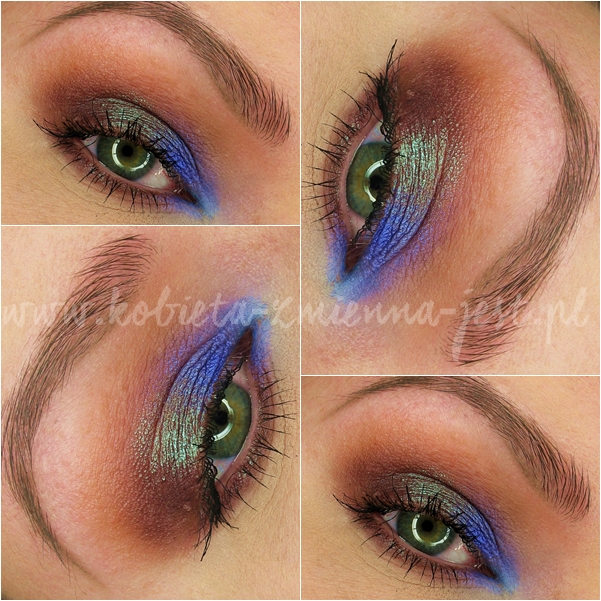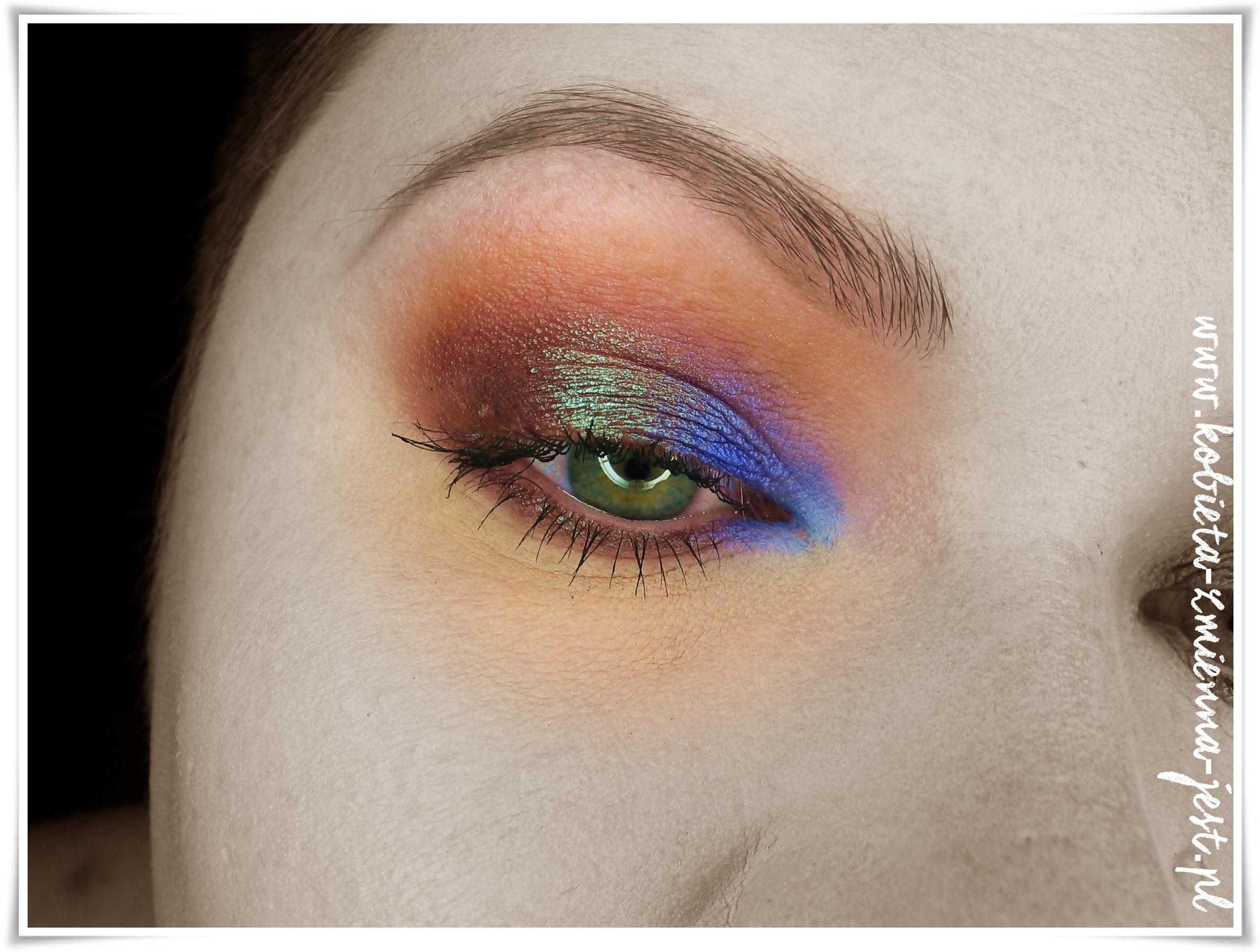 Zaczynam od zaznaczenia zewnętrznego kącika oraz załamania powieki burgundowym brązem (MAC #Sketch Eyeshadow). Następnie na sam środek powieki ląduje duochrom opalizujący na brązowo-zielono (Makeup Geek #Insomnia Pigment, ale odpowiednikiem jest także Inglot Pigment #85 lub cień Catrice #410 c’mon chameleon). Na pustą przestrzeń wewnętrznej części oka aplikuję białą kredkę (NYX Jumbo Eye Pencil #Milk), aby jeszcze bardziej zintensyfikować odcień fioletu. Na kredkę nakładam jaskrawy fiolet (cień z Technic Electric Beauty Bright Eyes Palette). Aby sam kącik wewnętrzny był minimalnie jaśniejszy od fioletu na powiece rozcieram go tłumiąc cielistym matem (Zoeva Cocoa Blend Palette #Bitter Start). Górną granicę załamania subtelnie ocieplam brązem w kolorze terakoty (Zoeva Cocoa Blend Palette #Substitute for love). Linię wody „czyszczę” cielistą kredką (Max Factor Kohl Pencil #090 Natural Glaze).