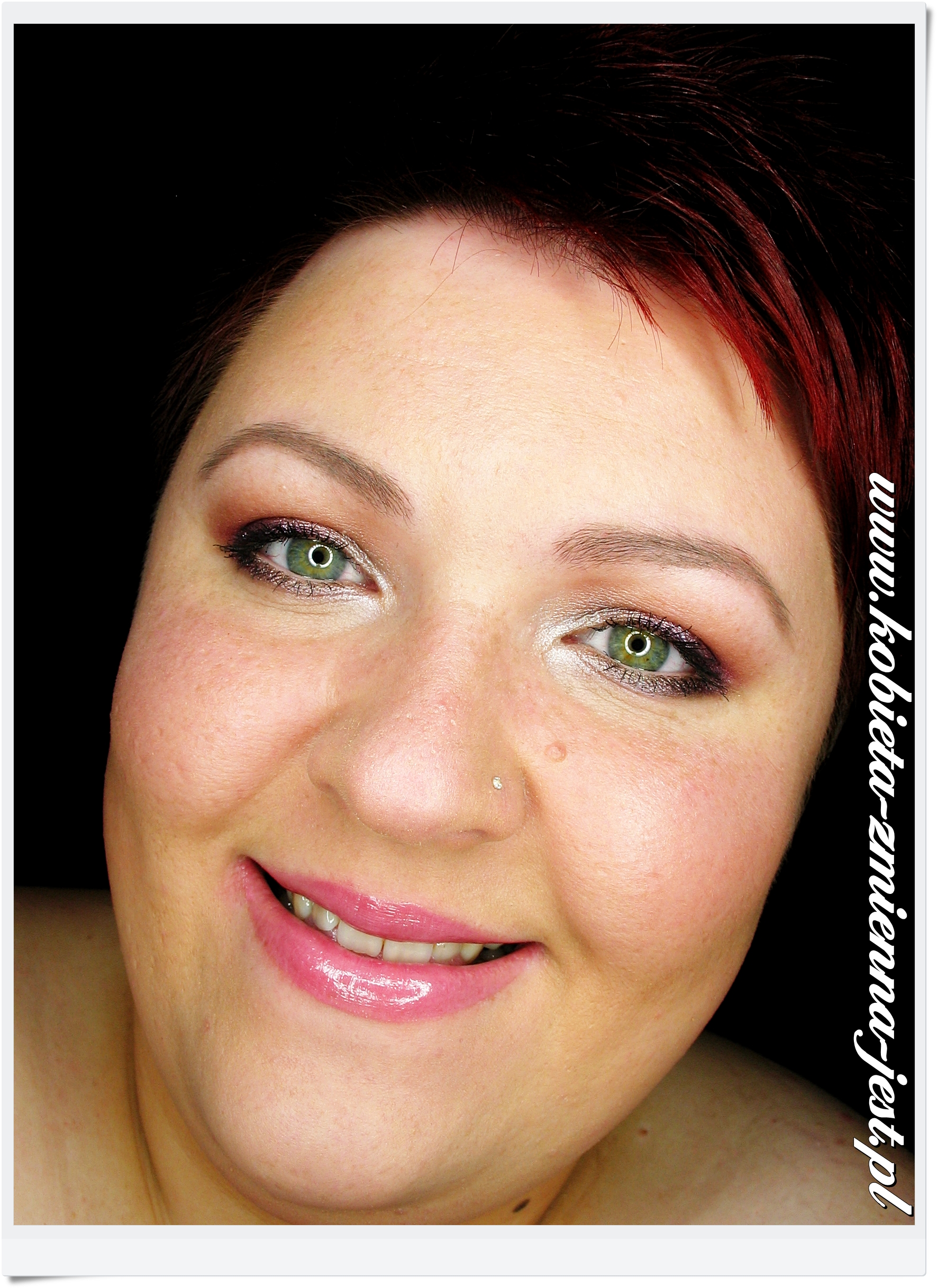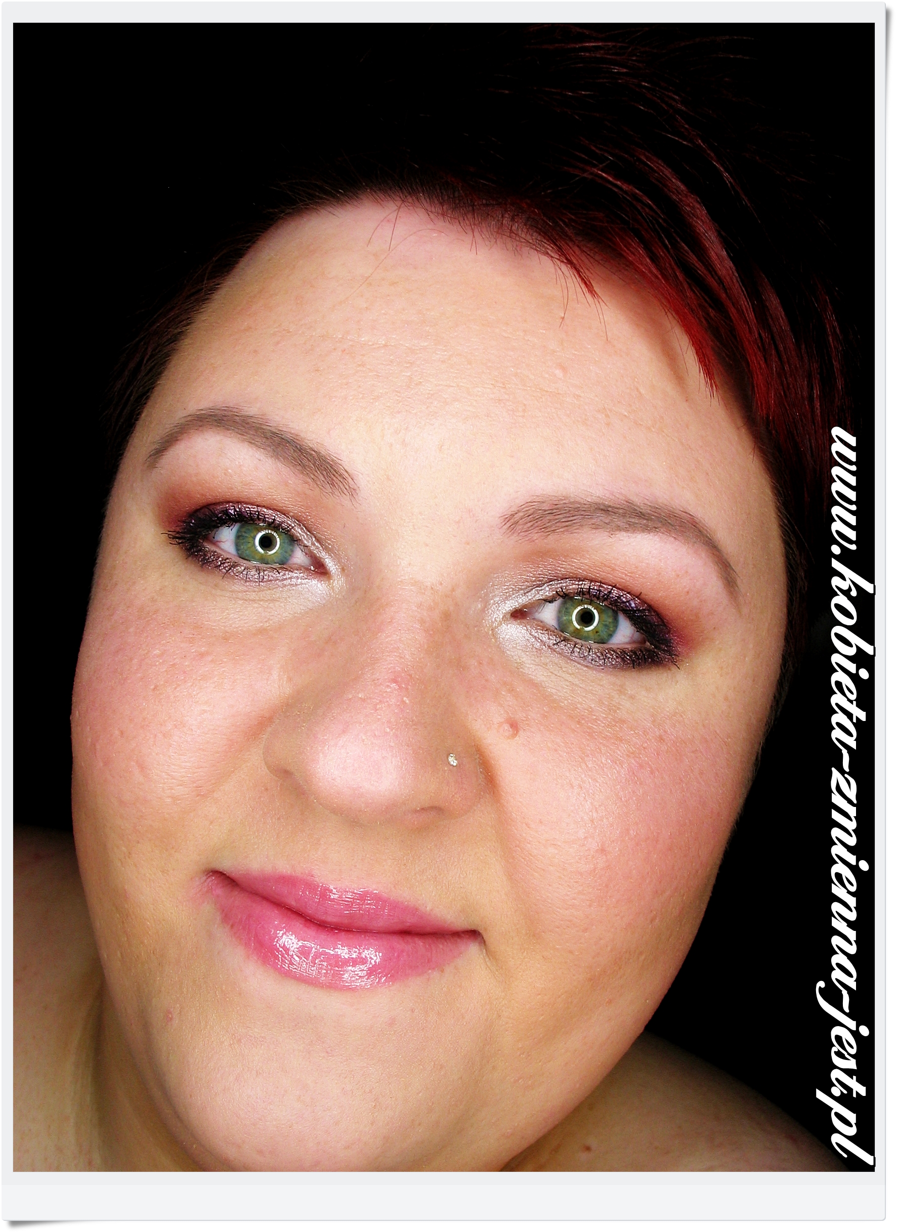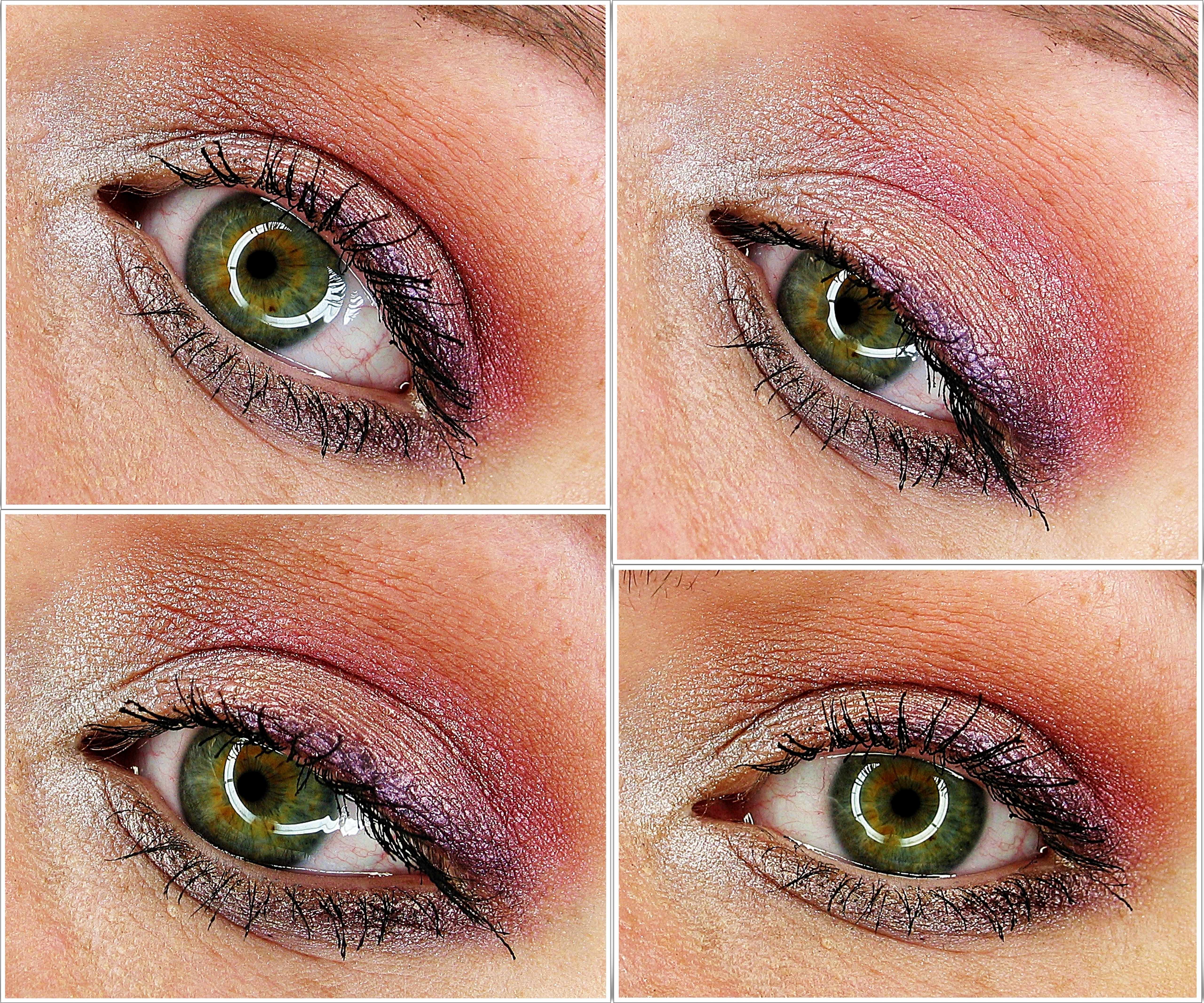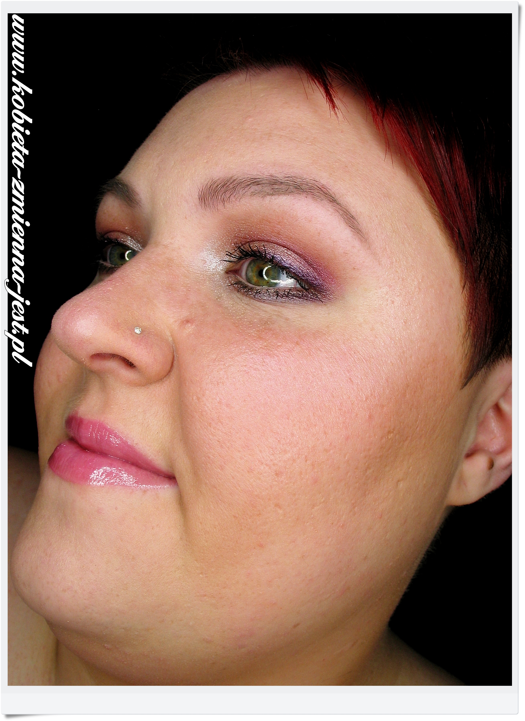 Załamanie powieki podkreślam czerwonawym brązem (cień Propose in Prague). Następnie od połowy powieki rysuję kreskę śliwkową kredką (Avon SuperShock Gel Eyeliner Pencil #Raw Plum). Na kredkę nakładam brudny róż (cień Marry in Monte Carlo) i prowadzę ten sam cień w zewnętrznym kąciku tworząc literę „C” kończąc w załamaniu powieki. Na środek powieki nakładam złoto (cień Meet in Madrid), a wewnętrzny kącik rozświetlam ikrzącym srebrem (cień Pretty in Paris). Dolną powiekę podkreślam złotem (cień Meet in Madrid) na całej długości i wzmacniam fioletem (cień Bliss in Barcelona), a w zewnętrznym kąciku dodatkowo ciemną śliwką (cień Forever in Florence). Na koniec kreskę na górnej powiece wzmacniam fioletem (cień Bliss in Barcelona), aby uzyskać wielowymiarowy kolor.