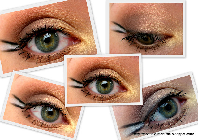 Najpierw zaczęłam od klasycznego brązowo – złotego dzienniaczka. Ponad załamaniem roztarłam smugę bardzo jasnego brązu (Inglot 390 Matte). W samym załamaniu oraz w zewnętrznym kąciku znalazł się ciemny odcień ciepłego brązu (Inglot 363 Matte). Wewnętrzny kącik rozświetla żółte złoto (Inglot 103 AMC Shine). Aby stworzyć fajne przejście pomiędzy zewnętrznym a wewnętrznym kącikiem, na środek powieki nałożyłam odcień starego złota (Inglot 112 AMC Shine) i dobrze zblednowałam z resztą kolorów. Następnie z górnej i dolnej lini rzęs poprowadziłam czarną kreskę (Inglot 391 Matte), która wychodzi po za kontur oka. Na górnej lini rzęs kreska gubi się wśród rzęs. Między obie kreski nałożyłam odrobinę białej kredki (Catrice Kohl Kajal 040 White), a na nią jeszcze biały cień (Inglot 496 Double Sparkle).