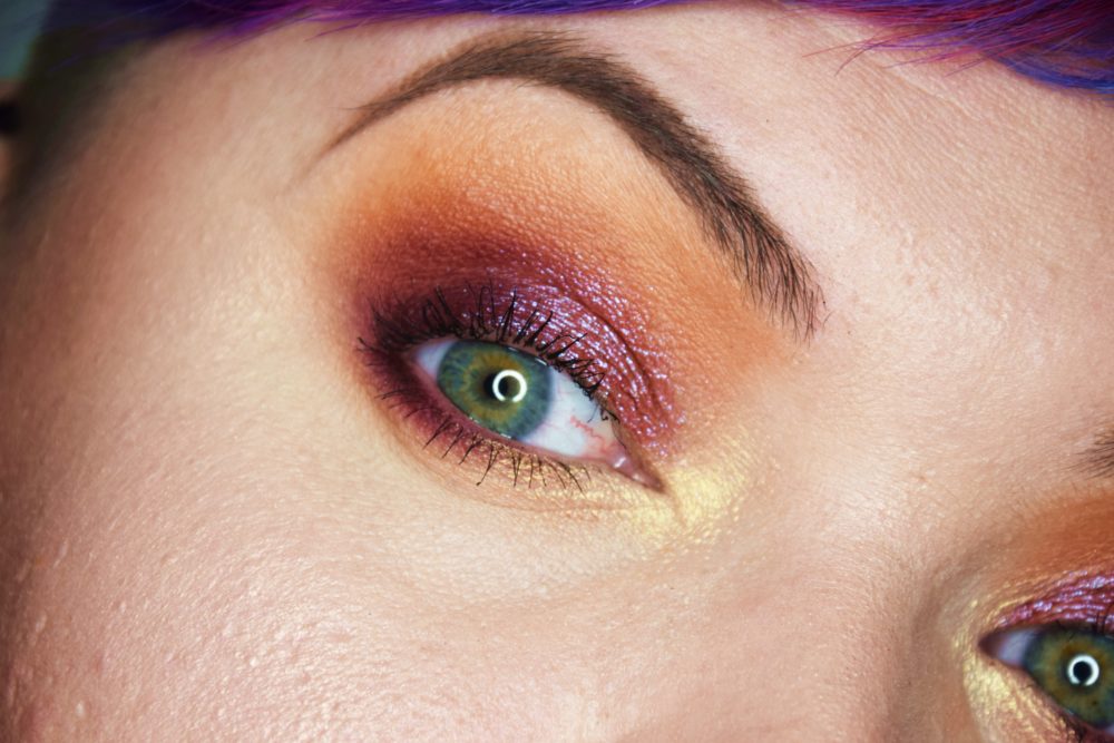 Nad załamaniem powieki rozcieram chmurkę musztardowej żółci (BPerfect Carnival Palette #Shuffle). Załamanie pogłębiam średnim brązem (BPerfect Carnival Palette #Basic). Zewnętrzny kącik traktuję brązem z nutką fioletu (BPerfect Carnival Palette #Liquor). Na pozostałą część powieki ruchomej palcem wcieram dżina. Dolną powiekę podkreślam brązem BPerfect Carnival Palette #Liquor), rozcieram od dołu średnim brązem (BPerfect Carnival Palette #Basic), a na koniec żółcią (BPerfect Carnival Palette #Shuffle). Wewnętrzny kącik rozpromieniam złotem (BPerfect Carnival Palette #Moony).