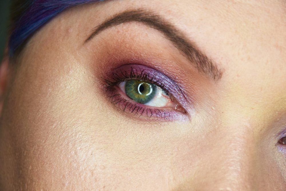 Matowię cielistym odcieniem całą przestrzeń pod brwią, a następnie zaznaczam załamanie powieki średnim, ciepłym brązem. Następnie zewnętrzny kącik traktuję śliwkowym brązem i wyciągam go w załamanie. Na środek powieki, jako cień przejściowy, nakładam purpurowy fiolet. Na pozostałą część powieki wklepuję zimnych, połyskujący fiolet. Dolną powiekę traktuje tak samo jak górną. Wewnętrzny kącik rozjaśniam tylko matową bielą.