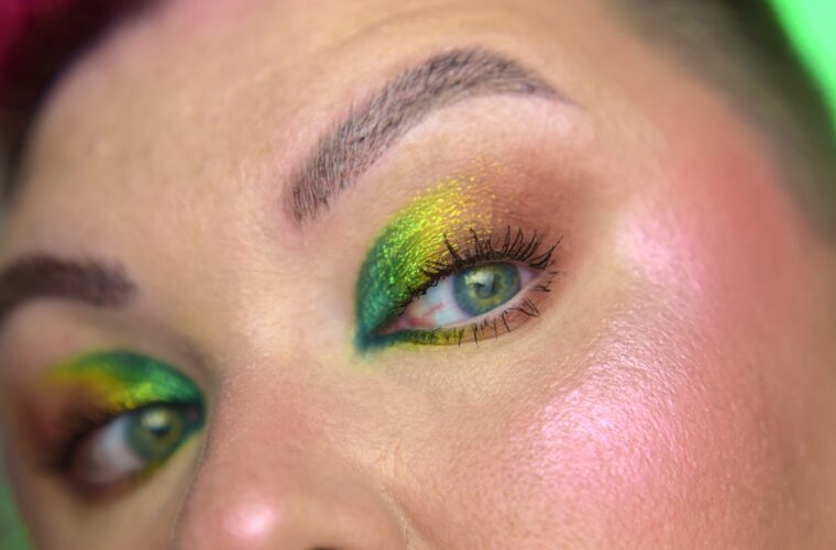 Zaczynam jednak przewrotnie od minimalnego zaznaczenia zewnętrznej części oka brązem [Glaminatrix Barely Basic #Review] dla stworzenia bazy. Nakładam brąz lekką ręką rozcierając go szybkimi ruchami ku skroni. Zieloną kredką [GlamShop W moro] podcinam cut crease i pokrywam nią obszar wewnętrznego kącika. Gruntuję kredkę od najciemniejszej zieleni [Glaminatrix Exquisite Eyes #Alluring], po pośredni odcień [Glaminatrix Exquisite Eyes #Magnificent], kończąc gradient na groszkowej zieleni [Glaminatrix Exquisite Eyes #Ostentatious]. Aby jeszcze bardziej podkreślić gradient kolorów, w samym wewnętrznym kąciku nakładam chłodniejszy odcień zieleni w błysku [Glaminatrix Barely Basic #GRWM], kończąc rozproszonym zielonkawym złotem [Glaminatrix Exquisite Eyes #Lovely].