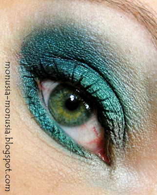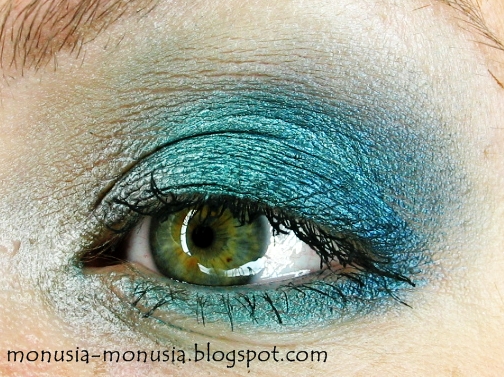 Aby wykonać ten makijaż wykorzystałam w tym celu paletkę Sleek Jewels. W pierwszej kolejności nałożyłam jako bazę czarny cień w kremie (Maybelline Color Tattoo 24H #60 Timeless Black). Na środek powieki nałożyłam elektryzujący turkus/szmaragd (paletka Sleek Jewels). W zewnętrznym kąciku nałożyłam granat (paletka Sleek Jewels), który następnie dobrze roztarłam z turkusem wyjeżdżając cieniem odrobinę ponad załamanie powieki. Na koniec wewnętrzny kącik rozświetliłam nietypowo brązem w kolorze taupe (Inglot 408 P).