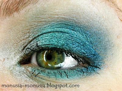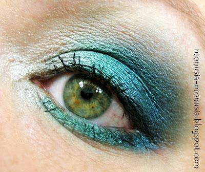 Jest to w sumie smokey eye w trój kolorze: w zewnętrznym kąciku głęboki granat, na środku powieki energetyczny turkus, a dla odmiany wewnętrzny kącik rozjaśnia nie jakaś tam szarość czy biel, a brąz w odcieniu taupe!