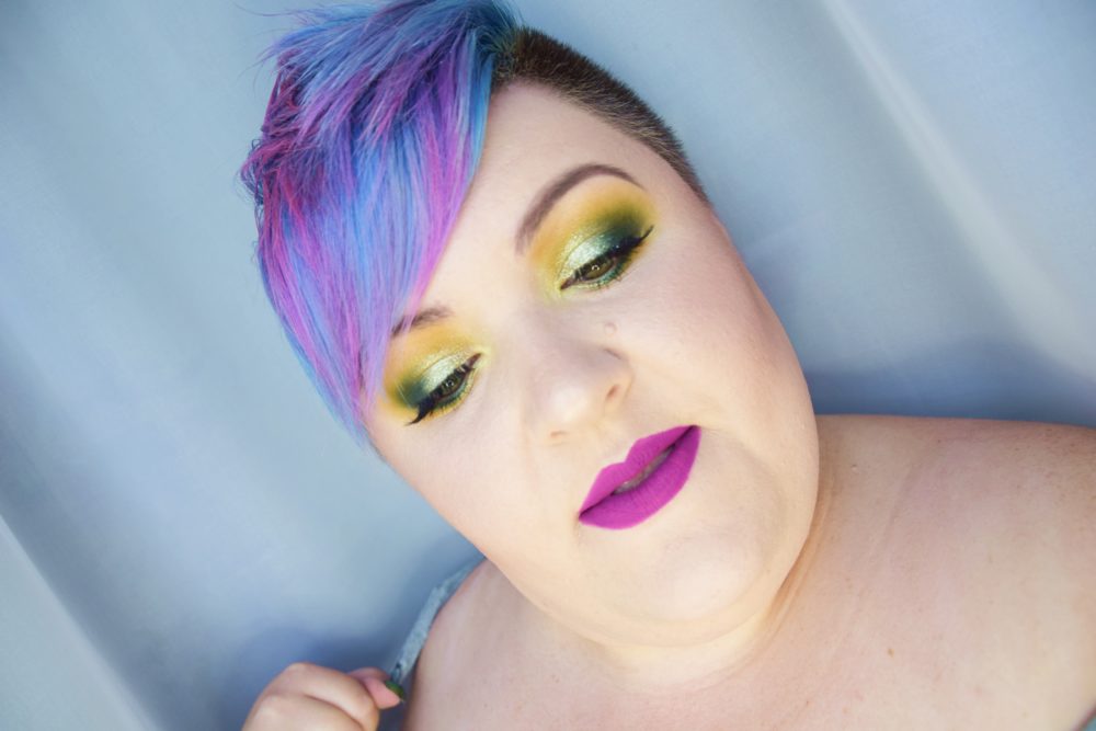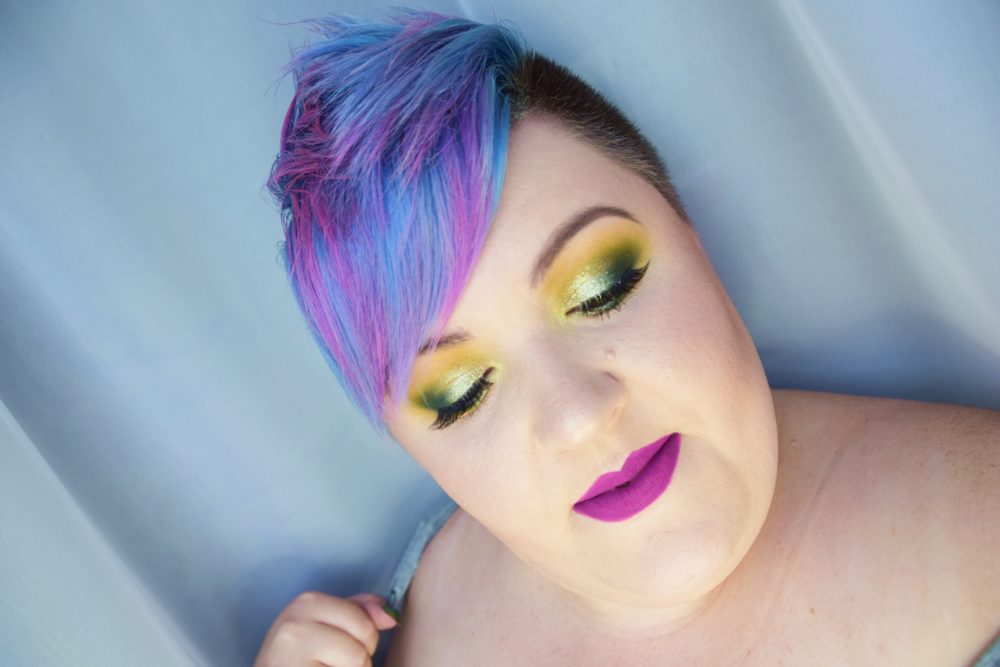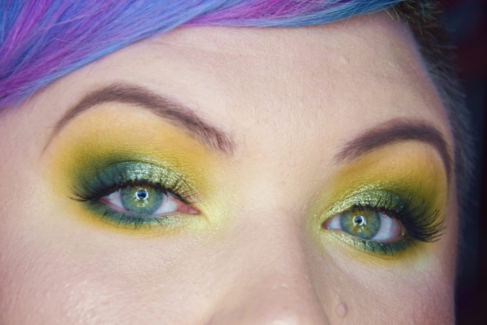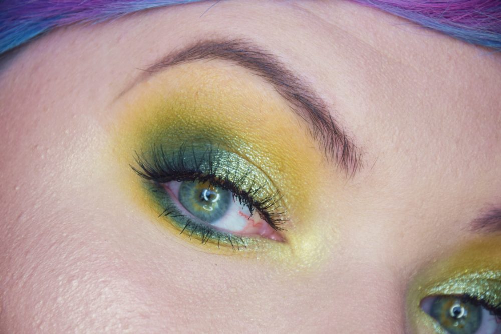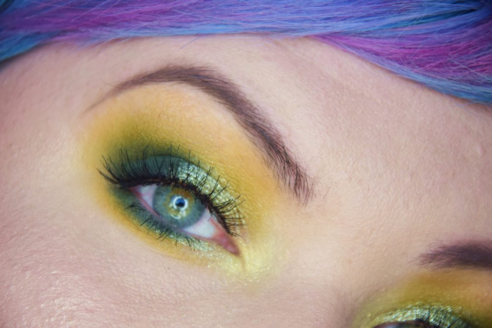 Zaczynamy oczywiście od zbudowania załamania powieki. Pokrywam cały obszar powieki matowym cielakiem (MORPHE x Jaclyn Hill Dark Magic Palette: Poof), aby łatwiej się blendowało. Kolejno sięgam po musztardową żółć (MORPHE x Jaclyn Hill Armed&Gorgeous Palette: Access) i dość wysoko rozcieram nad załamaniem. W samo załamanie nakładam zgniłą zieleń (MORPHE 35M Palette: Express Yo’Self). Zewnętrzny kącik traktuję głęboką zielenią (MORPHE x Jaclyn Hill Dark Magic Palette: Inside Job) i przeciągam ją także w załamanie powieki. Na pozostałą część ruchomej powieki aplikuję folię w nieoczywistym odcieniu zieleni (HUDA BEAUTY Emerald Obsessions Palette). Dolną powiekę najpierw podkreślam ciemną zielenią (MORPHE x Jaclyn Hill Dark Magic Palette: Inside Job), a później od dołu rozcieram żółciom (MORPHE x Jaclyn Hill Armed&Gorgeous Palette: Access), a pomiędzy oba kolory rozcieram jeszcze zieleni w kolorze khaki (MORPHE x Jaclyn Hill Dark Magic Palette: Potion). Wewnętrzny kącik rozświetlam złotem lekko rozbielonym (HUDA BEAUTY Emerald Obsessions Palette + MORPHE x Jaclyn Hill Armed&Gorgeous Palette: VIP).