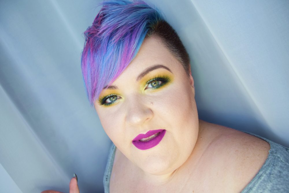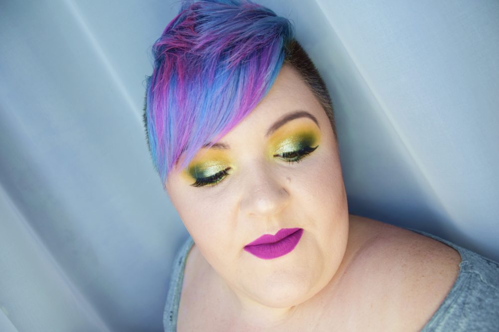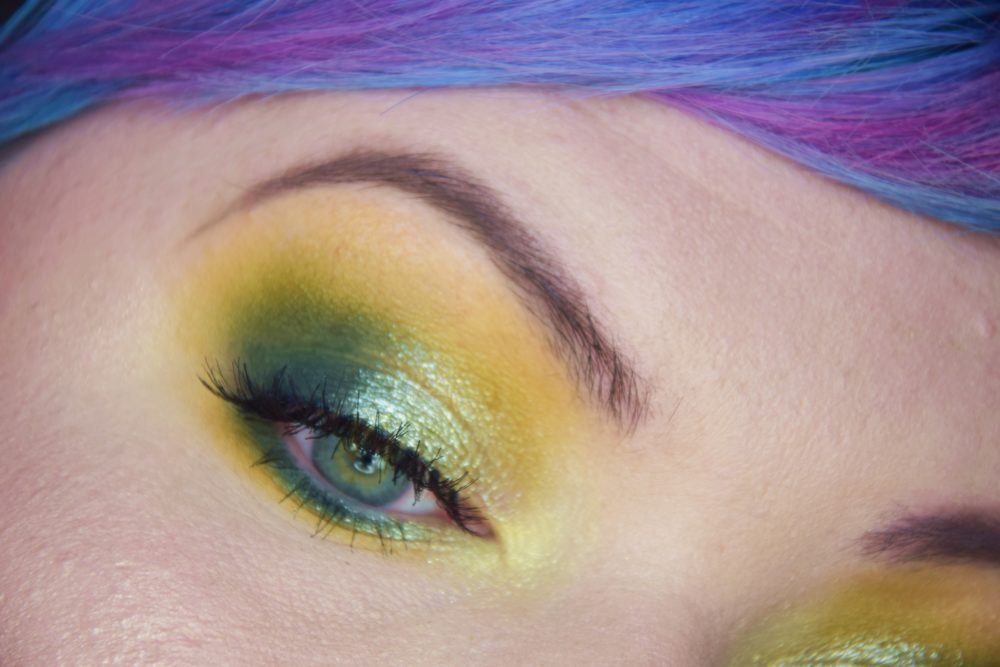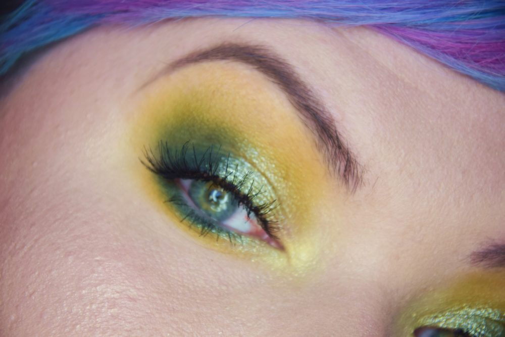 Zaczynamy oczywiście od zbudowania załamania powieki. Pokrywam cały obszar powieki matowym cielakiem (MORPHE x Jaclyn Hill Dark Magic Palette: Poof), aby łatwiej się blendowało. Kolejno sięgam po musztardową żółć (MORPHE x Jaclyn Hill Armed&Gorgeous Palette: Access) i dość wysoko rozcieram nad załamaniem. W samo załamanie nakładam zgniłą zieleń (MORPHE 35M Palette: Express Yo’Self). Zewnętrzny kącik traktuję głęboką zielenią (MORPHE x Jaclyn Hill Dark Magic Palette: Inside Job) i przeciągam ją także w załamanie powieki. Na pozostałą część ruchomej powieki aplikuję folię w nieoczywistym odcieniu zieleni (HUDA BEAUTY Emerald Obsessions Palette). Dolną powiekę najpierw podkreślam ciemną zielenią (MORPHE x Jaclyn Hill Dark Magic Palette: Inside Job), a później od dołu rozcieram żółciom (MORPHE x Jaclyn Hill Armed&Gorgeous Palette: Access), a pomiędzy oba kolory rozcieram jeszcze zieleni w kolorze khaki (MORPHE x Jaclyn Hill Dark Magic Palette: Potion). Wewnętrzny kącik rozświetlam złotem lekko rozbielonym (HUDA BEAUTY Emerald Obsessions Palette + MORPHE x Jaclyn Hill Armed&Gorgeous Palette: VIP).