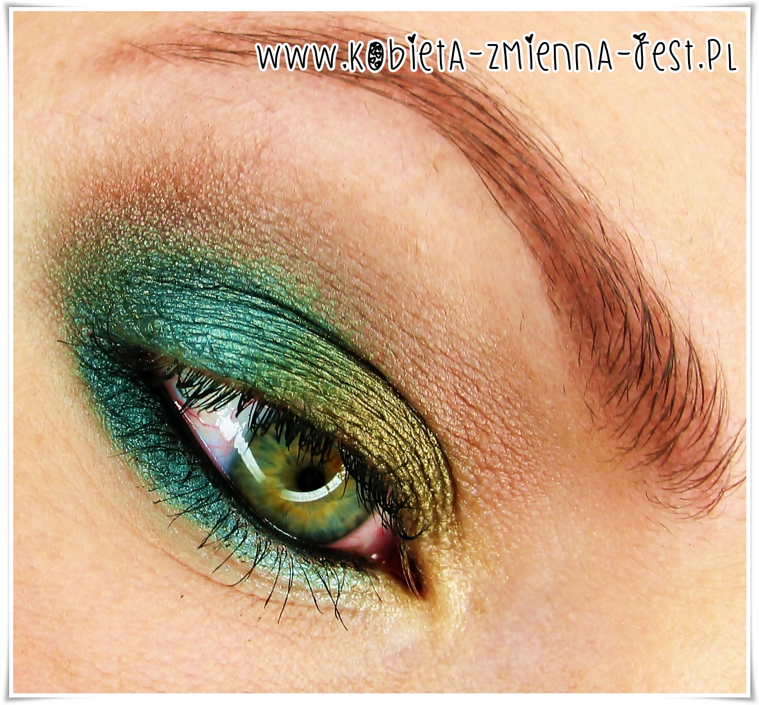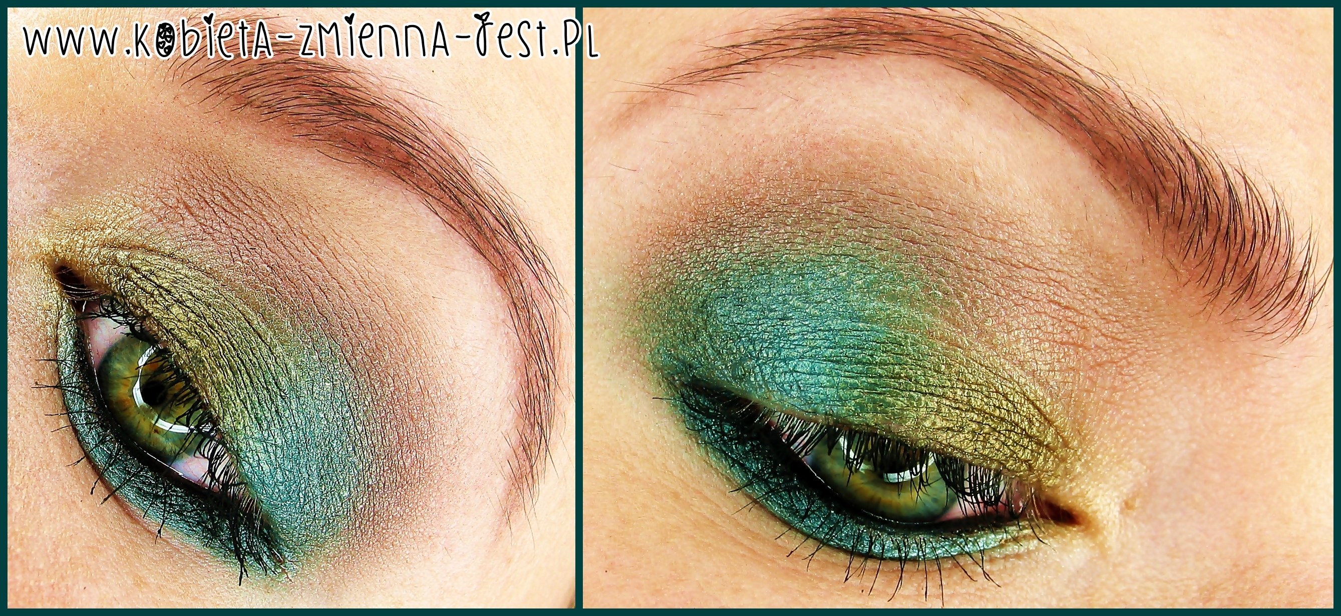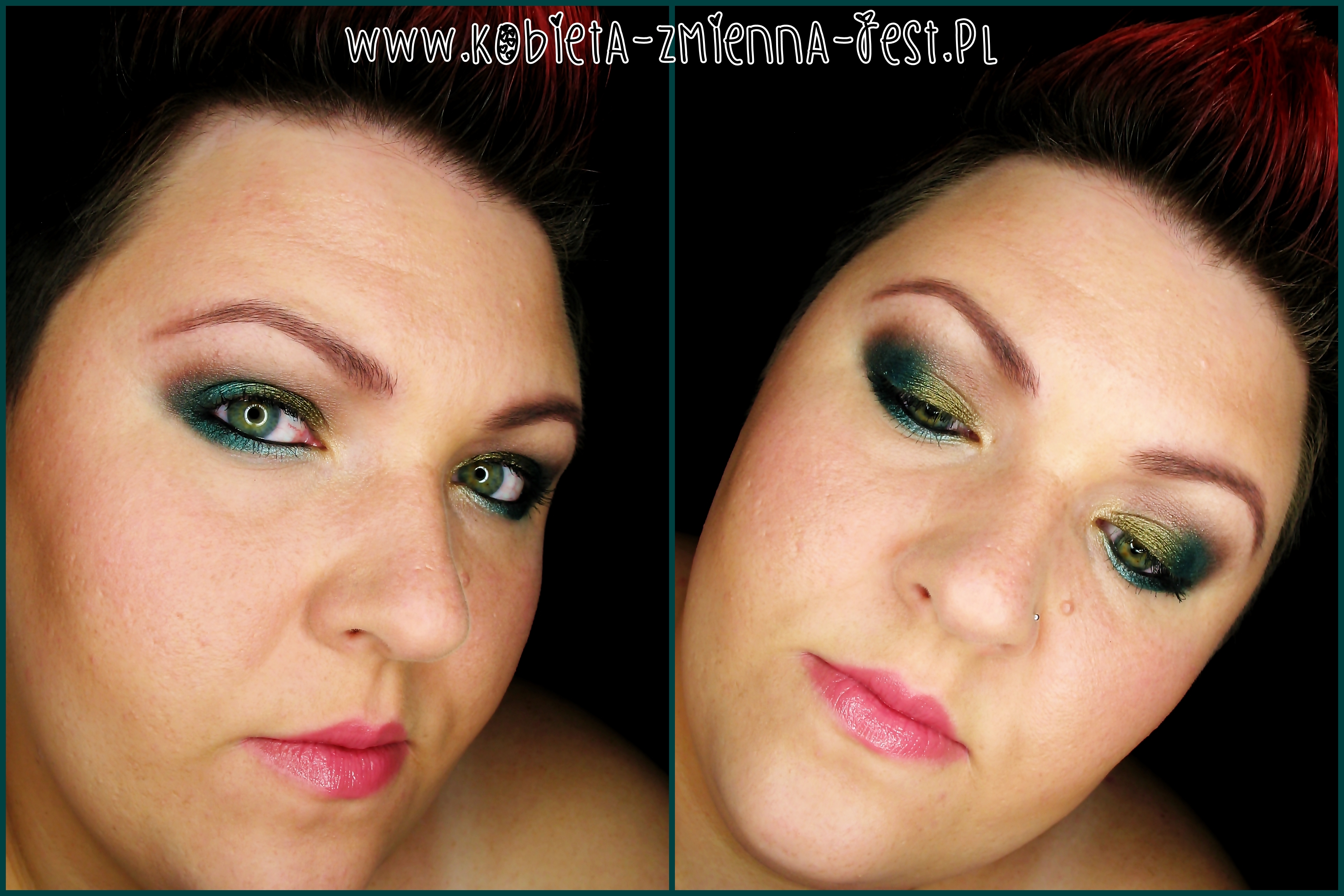 Zaczynam od tak naprawdę tylko zaznaczenia konturu załamania powieki matowym brązem (Inglot 378 M). Następnie na 2/3 powieki ruchomej nakładam metaliczną khaki (paletka Sleek Jewels). Zewnętrzny kącik pokrywam szmaragdowym cieniem (paletka Sleek Jewels), łącze z khaki i wyciągam odrobinę w załamanie. Kolejno górną granicę załamania oraz wcześniej nałożony szmaragdowy i khaki rozcieram metalicznym brązem w odcieniu burgundu (paletka Sleek Jewels). Dolną powiekę na 2/3 jej długości pokrywam tym samym szmaragdowym cieniem, a 1/3 miętowym cieniem (paletka Sleek Jewels). Wewnętrzny kącik rozjaśniam tylko perłowym beżem (paletka Sleek Jewels). Na linię wody dla kontrastu nakładam czarną kredkę.