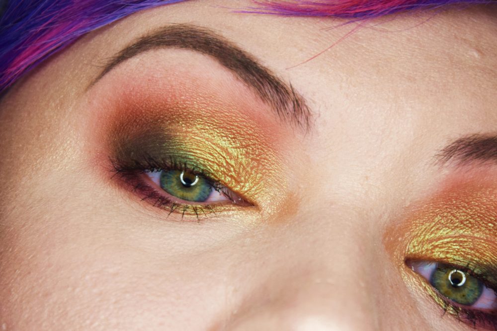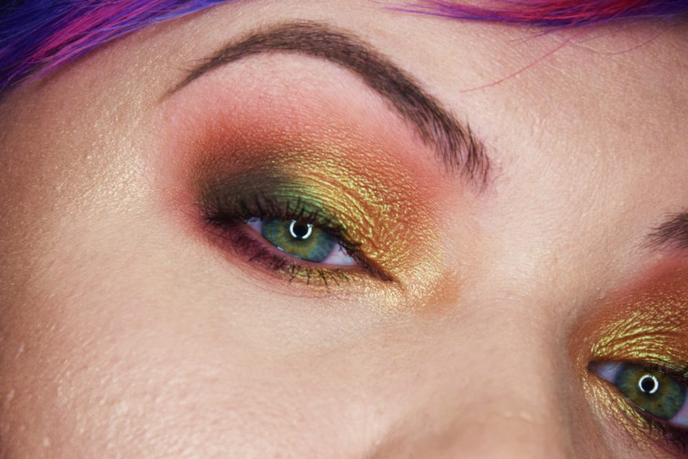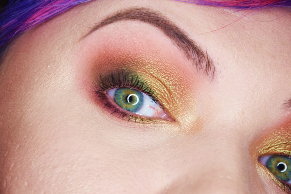 Zaczynam od zaznaczenia załamania powieki brzoskwiniowym łososiem (odcień nr 76) jako cień transferowy [step 1]. Następnie pogłębiam załamanie bardzo ciepłym brązem (odcień nr 78) [step 2]. Kolejno wewnętrzną część powieki pokrywam złotem opalizującym na zielono (odcień nr 81) [step 3]. W zewnętrznym kąciku, w dość nietypowym kształcie trójkąta, aplikuję głęboką zieleń (odcień 82) [step 4]. Po łuk brwiowy nakładam matowy cielisty odcień (odcień nr 75) dodatkowo rozcierając górną granicę [step 5]. Dolną powiekę do połowy podkreślam purpurowym brązem (odcień nr 80) [step 6], który od dołu rozcieram brązem [step 2] a następnie łososiem [step 1]. Wewnętrzną część dolnej powieki oczywiście traktuję złotem [step 3].