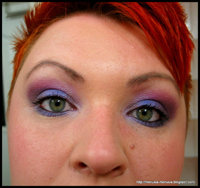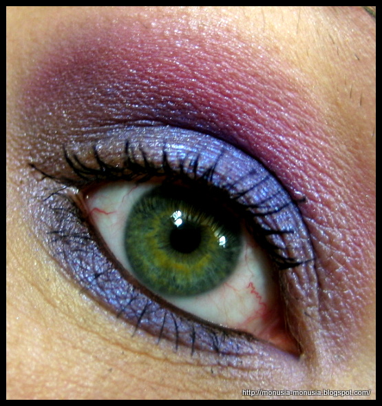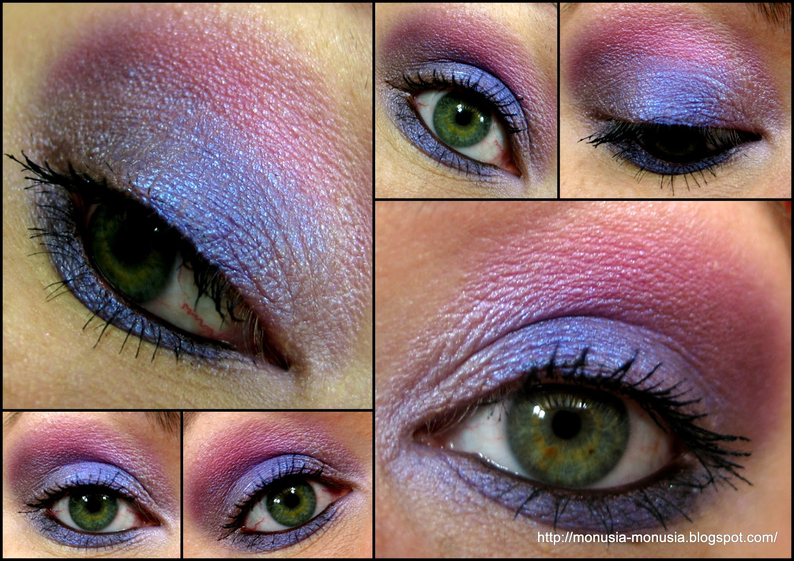 Na środek powieki nałożyłam zimnych, opalizujący na niebiesko fiolet (cień nr 1). W zewnętrznym kąciku jest mglisty, przybrudzony fiolet (cień nr 2). W załamaniu powieki roztarłam ciepły, lekko opalizujący na niebiesko róż (cień nr 3). Kącik wewnętrznym rozświetliłam liniowym odcieniem (cień nr 4). Jako dodatek na linii wodnej kredka w kolorze ciemnej śliwki (Avon SuperShock Gel Eyeliner Pencil Blackberry). Granice cieni pod łukiem brwiowy roztarłam matowym cielaczkiem (Inglot 353 Matte).