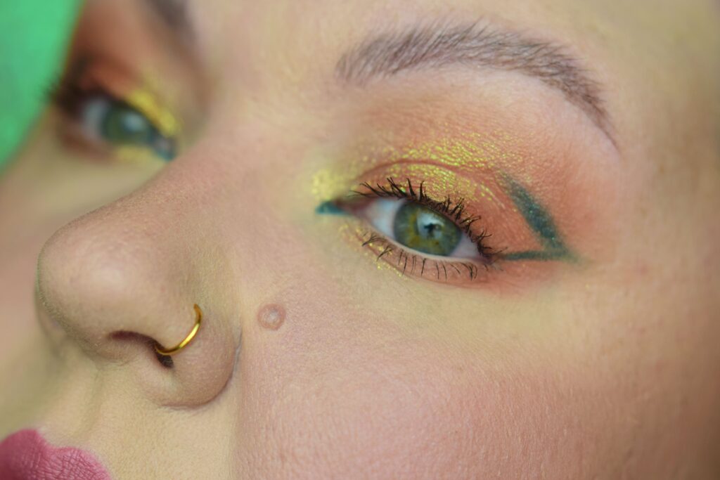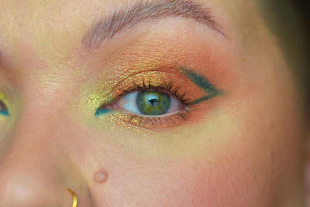 - Środek powieki pokrywam pomarańczem opalizującym na zielono – złoto [GlamShop Kwiat Paproci #Swaróg];