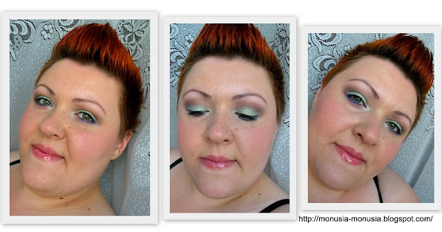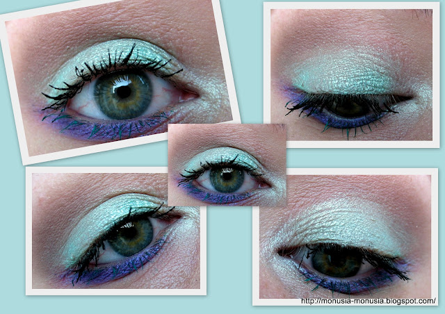 Aby góra pasowała tematycznie do dołu i odwrotnie to… w załamaniu znalazł się lekki brąz wpadający w fiolet (Inglot 358 Matte), który pasował do pastelowego fioletu na dolnej powiece (Inglot 439 Pearl). Na górnej powiece błyszcząca mięta (Kobo 213 Green Pistachio), a do kompletu na dolnej powiece zielone rzęsy (INGLOT Colour Play Mascara 02 Green). Łącznikiem między górą i dołem był seledynowy pigment (Kobo Pure Pearl Pigment 504 Mint Cream) w wewnętrznym kąciku.