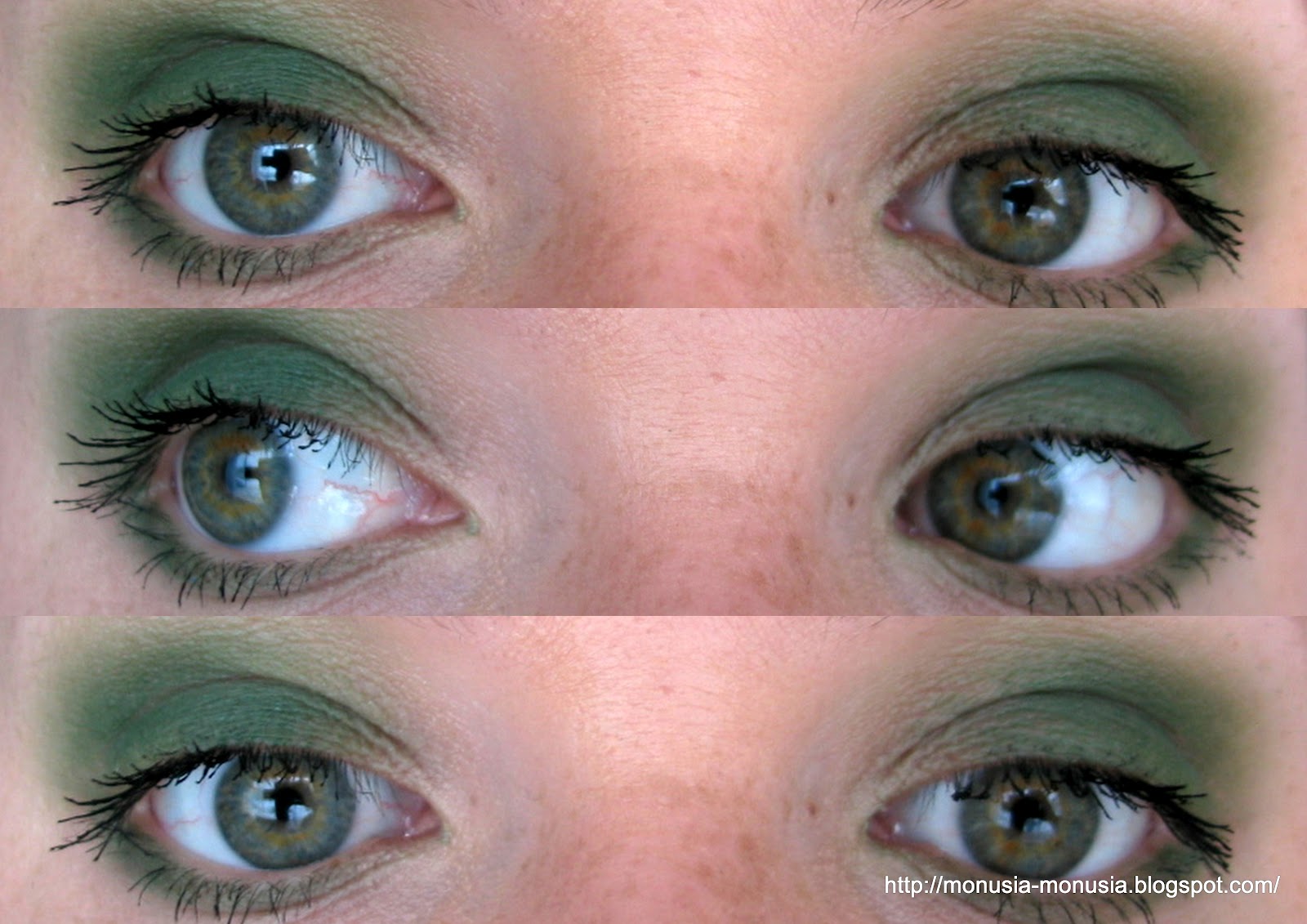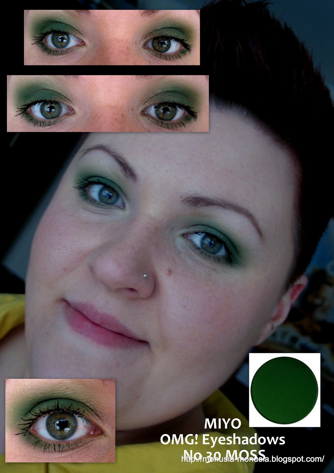 Mech na oczkach czyli…. tak naprawdę prezentacja cienia MIYO OMG! Eyeshadows no 30 o wdzięcznej nazwie MOSS. Piękna, matowa, średnia zieleń. Nic odkrywczego w tym makijażu… tu chodzi o cień. Może nie kryje idealnie (ma lekkie prześwity), ale jak się nad nim popracuje to daje całkiem ładny, świeży efekt zieleni. Bardzo przyjemnie się go rozciera, a na granicy roztarcia zamienia się w lekką żółć.