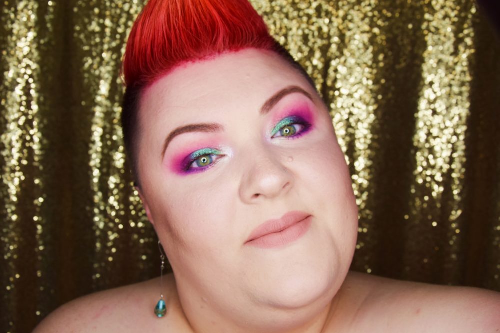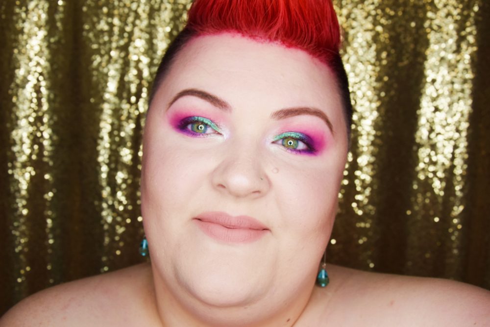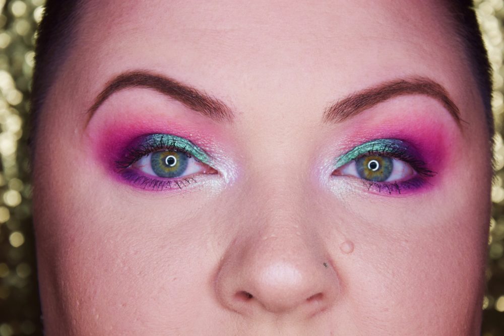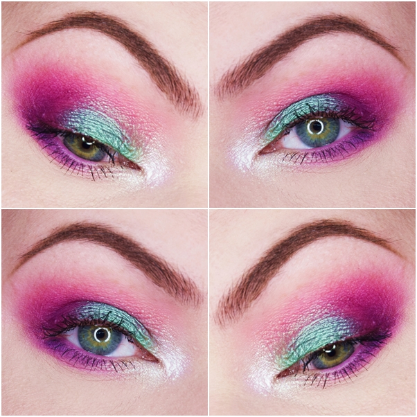 Załamanie powieki podkreślam mocnym różem (Juvia’s Place The Masquerade #Bori), a następnie je dodatkowo przyciemniam i pogłębiam purpurą (Juvia’s Place The Masquerade #Zobo). Na 2/3 powieki ruchomej aplikuję zieleń (Juvia’s Place The Masquerade #Mali), zewnętrzny kącik intensyfikuję fioletem (Juvia’s Place Zulu Palette). Wewnętrzny kącik rozjaśniam bielą opalizującą na zielono (H&M Holographic Eyeshadow Palette). Gotowe 😉