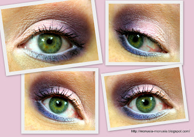 W oryginale nie ma zaznaczonego załamania powieki ponieważ modelka tego nie wymagała, ale moja powieka niestety tak. Dlatego też makijaż zaczęłam od podkreślenia załamania powieki średnim, matowym brązem (Inglot 360 Matte), który nie będzie zbytnio widoczny, bo zakryty innymi cieniami, ma tylko służyć korekcie oka. W sam kącik oka nakładam bladoróżowy cień (Inglot 488 Double Sparkle), na środek powieki nakładam różową perłę w ciepłym odcieniu (Inglot 436 Pearl). Zewnętrzny kącik przyciemniam ciepłym odcieniem fioletu/fuksją (Inglot 486 Double Sparkle) i wyciągam odrobinę w załamanie łącząc z brązem. Dolną powiekę w zewnętrznym kąciku podkreślam śliwkowym matem (Inglot 377 Matte), na środek nakładam jasny fiolet z domieszką błękitu (Inglot 379 Matte), wewnętrzny kącik mocno rozświetlam białą perłą (Inglot 453 Pearl). Dla dodatkowego rozświetlenia i otwarcia oka na linię wody nakładam białą kredkę.