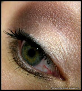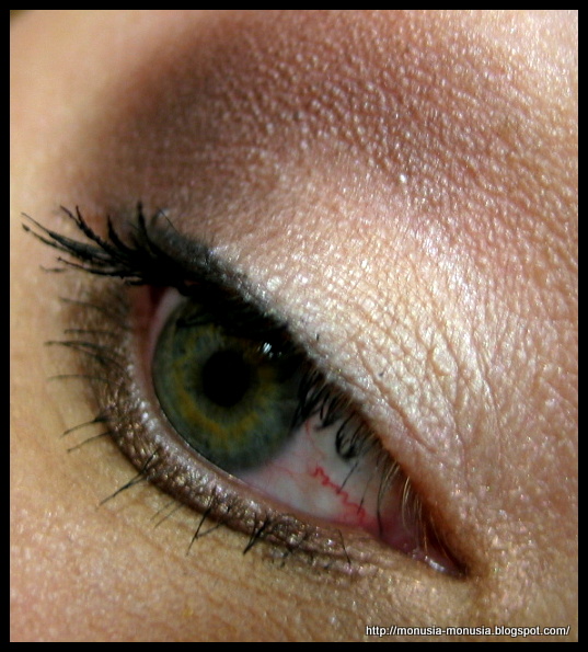 Zależało mi na uzyskaniu lekkiego, satynowego błysku. Dlatego na całą ruchomą powiekę i całą przestrzeń pod łukiem brwiowym nałożyłam perłę w kolorze skóry (Inglot 393 Pearl). Aby przetransformować ją w satynę na perłę nałożyłam mat w takim samy odcieniu (Inglot 353 Matte) i dobrze ze osobą zmieszałam. W załamanie trafił średni, ciepły odcień brązu (Inglot 363 Matte). Zewnętrzny kącik oka tylko lekko okrasiłam ciemniejszym brązem (Inglot 53 AMC). Dolną powiekę pokreśliłam ciepłym, błyszczącym brązem (Inglot 409 Pearl). Wewnętrzny kącik oka rozświetliłam złotem opalizującym na różowo (Inglot 142 AMC Shine). Linię rzęs zagęściłam czarnym cieniem (Inglot 391 Matte). Linię wody „wyczyściłam” kredką w kolorze szampana (Avon SuperShock Gel Eyeliner Pencil Golden Fawn).