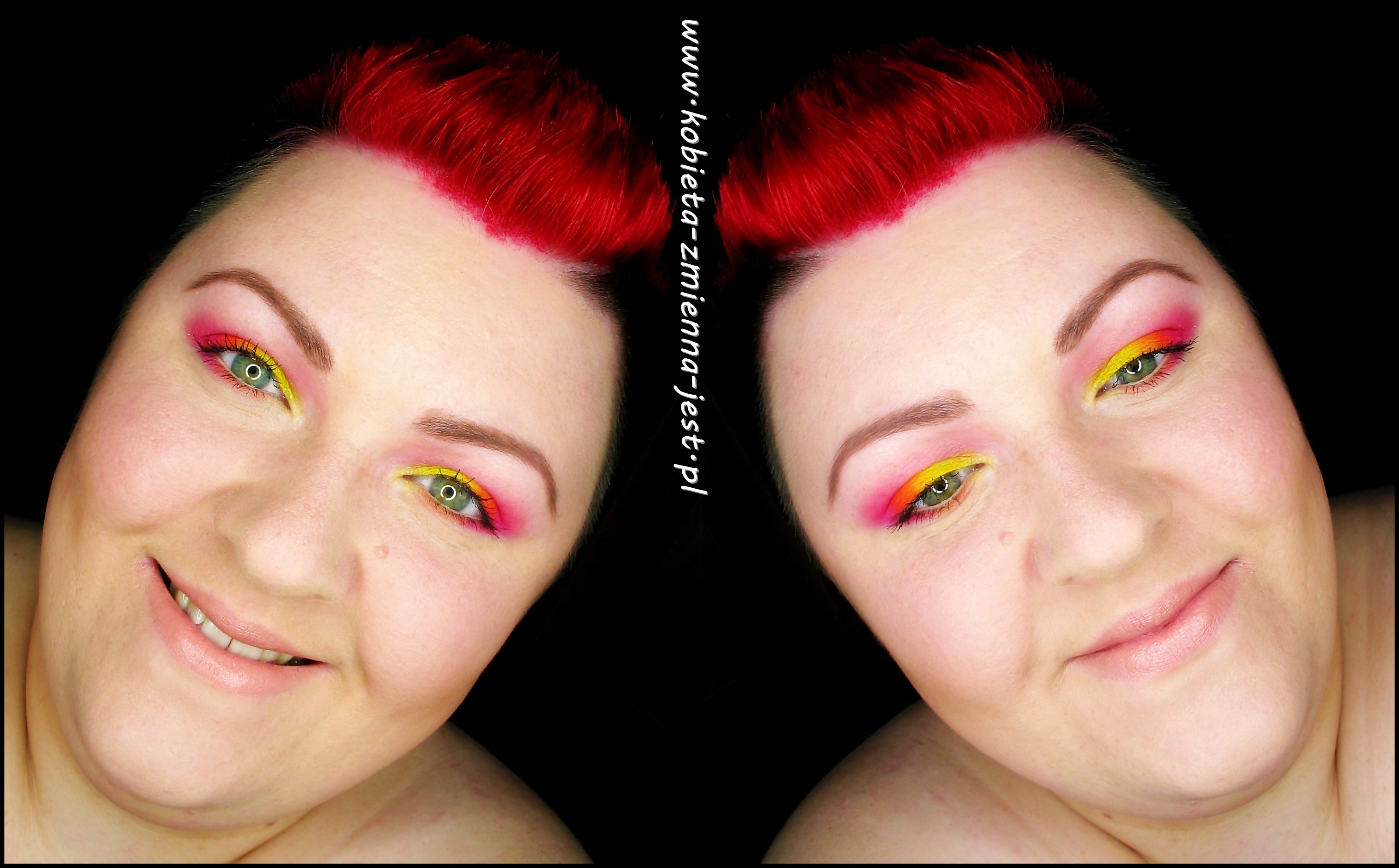Zaczynam od białej bazy (NYX Jumbo Eyeshadow Pencil #Milk), aby maksymalnie podkręcić kolory. Następnie od wewnętrznego kącika nakładam i rozcieram: żółć (paletka Sleek Ultra Mattes v1 Brights #Bammi), pomarańcz (paletka Sleek Ultra Mattes v1 Brights #Strike) oraz róż (paletka Sleek Ultra Mattes v1 Brights #Pout). Kolejno w załamaniu rozcieram odrobinę jaśniejszy róż (paletka Sleek Ultra Mattes v1 Brights #Pucker), a jego granice rozmywam bardzo bladym różem (paletka Sleek Ultra Mattes v1 Brights #Floss). Pod łukiem brwiowym i w samym wewnętrznym kąciku aplikuje lekko bananowy jasny cień (paletka Sleek Ultra Mattes v1 Brights #Pow!).