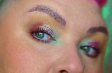 W wewnętrznym kąciku znalazło się białe złoto (Inglot 103 AMC Shine). Na środku powieki nałożyłam bardziej musztardowy odcień złota (Inglot 430 Pearl). W zewnętrznym kąciku oraz w załamaniu zagościł czerwony odcień brązu, coś pomiędzy bordowym a brązowym cieniem (Inglot 452 Pearl). Czerwony brąz „przybrudziłam” troszeczkę matową czernią (Inglot 391 Matte).