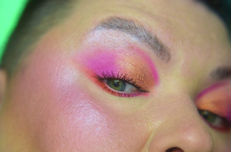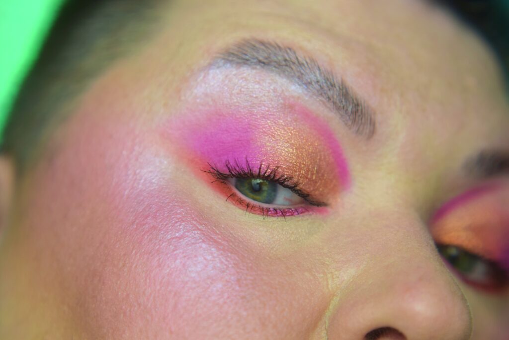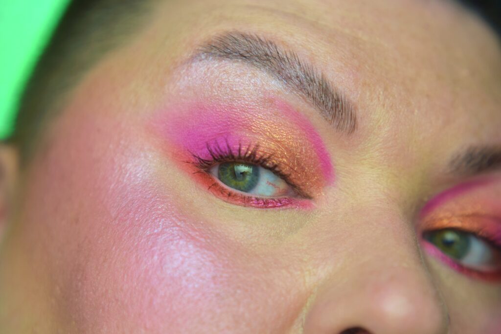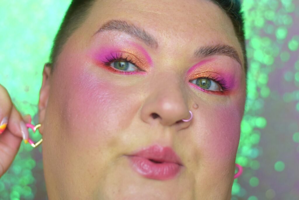 Chciałam coś lekkiego, energetycznego i nietuzinkowego na koniec lata. Zamysł pierwotny był taki: dwa kolory w dwóch wykończeniach matu i błysku zestawione na krzyż. Akurat padło na róż i pomarańcz. Żeby sobie ułatwić sięgnęłam po paletę typu tęcza czyli Glamlite Rick and Morty, aby mieć wszystko w jednym. W „praniu” wyszły jeszcze dodatkowo kreski dla podkreślenia kształtu całości. Czasami warto dać się ponieść fantazji…