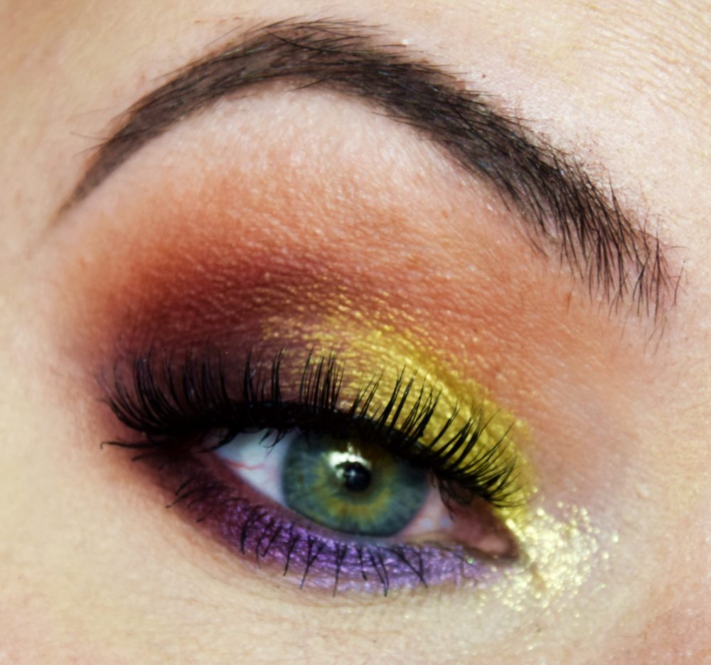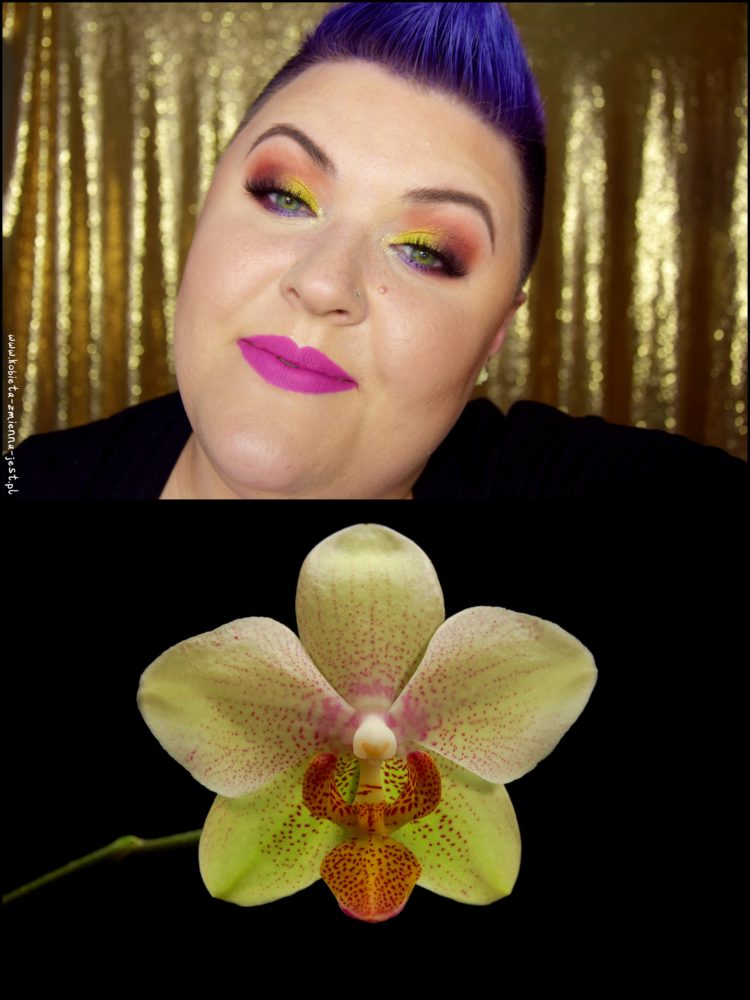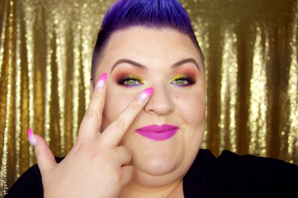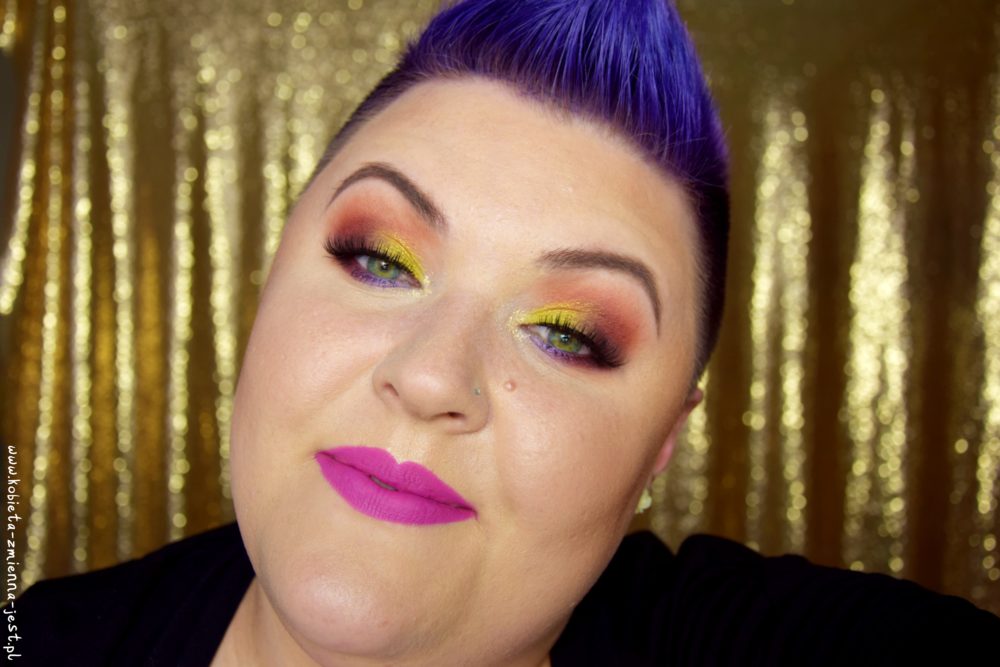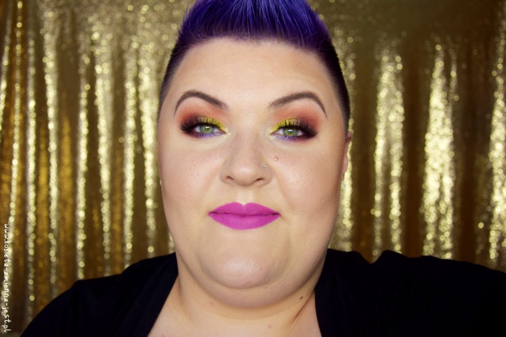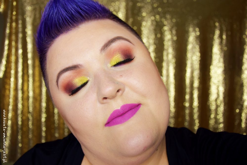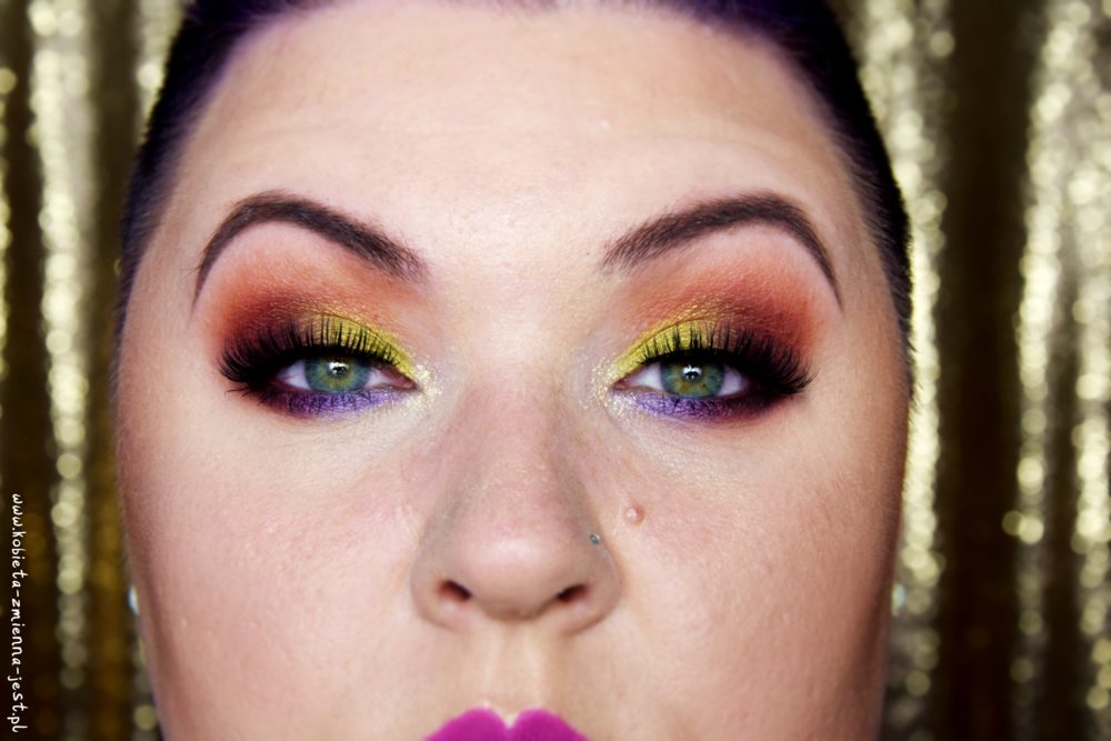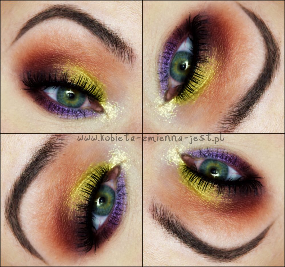 Zaczynam od wstępnego ocieplenia obszaru nad załamaniem powieki ceglanym brązem (Nabla #Paprika). Następnie fioletowym brązem (Nabla #Mimesis) zaczynam stopniowo przyciemniać zewnętrzny kącik oraz wyciągam ten sam cień w załamanie powieki. Aby zintensyfikować i przyciemnić dodatkowo zewnętrzny kącik dodaje czerni (Glamshadows #Baba Jaga). Na resztę powieki nakładam limonkową zieleń (Glamshadows #Limonka). Na dolną powiekę nakładam mieszankę fioletowego brązu i czerni (Nabla #Mimesis + Glamshadows #Baba Jaga) a wewnętrzną część