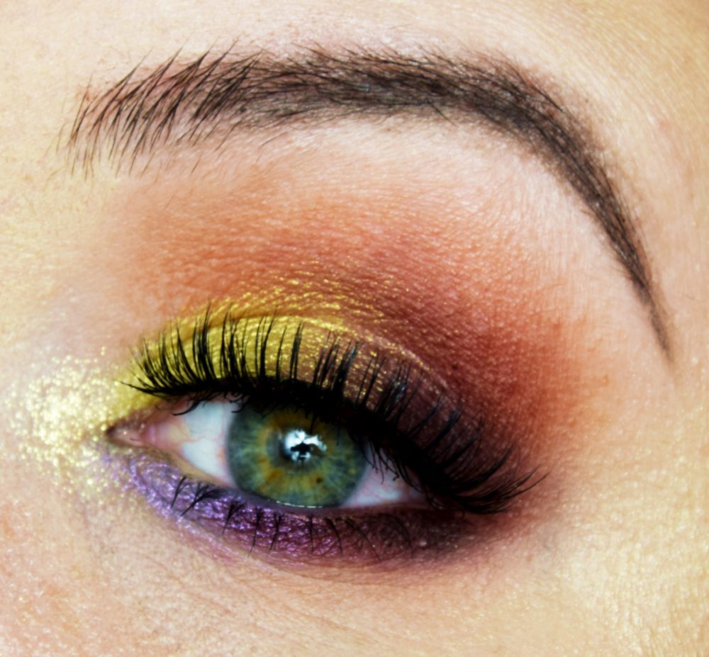 ubarwiam fioletowym duochromem (Devinah #Vicious). Aby otrzymać efekt mocnego rozbledowania, granice całość dodatkowo traktuje cieniem transferowym (Glamshadows #Kakaowa Cegła). Już na samiutkim końcu matowym beżem (Glamshadows #Matowy Cielak) traktuje obszar pod brwią, a wewnętrzny kącik roziskrzam złotem (Devinah OMG Face and Body Highlighter).