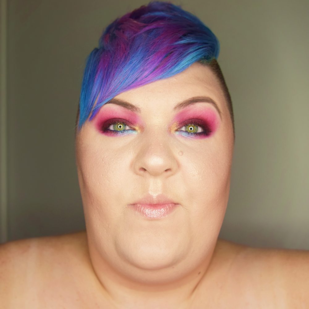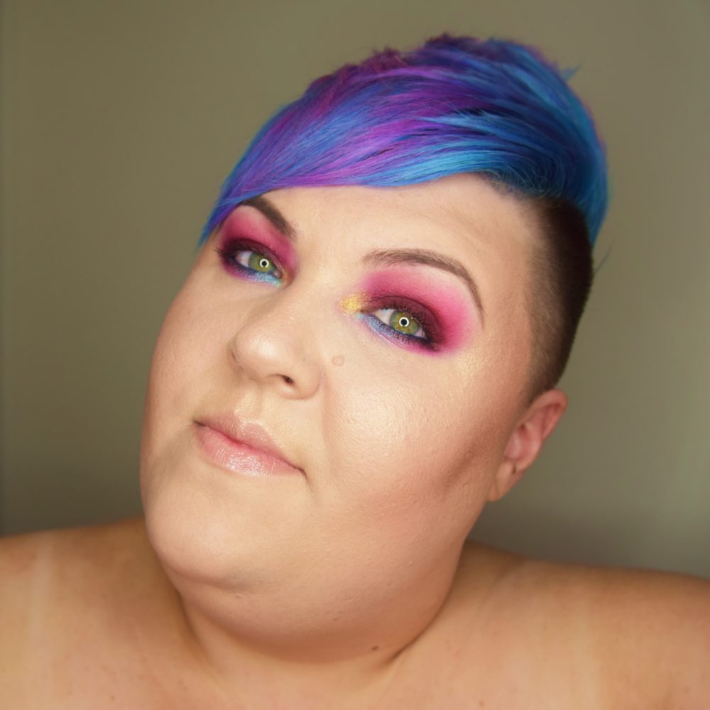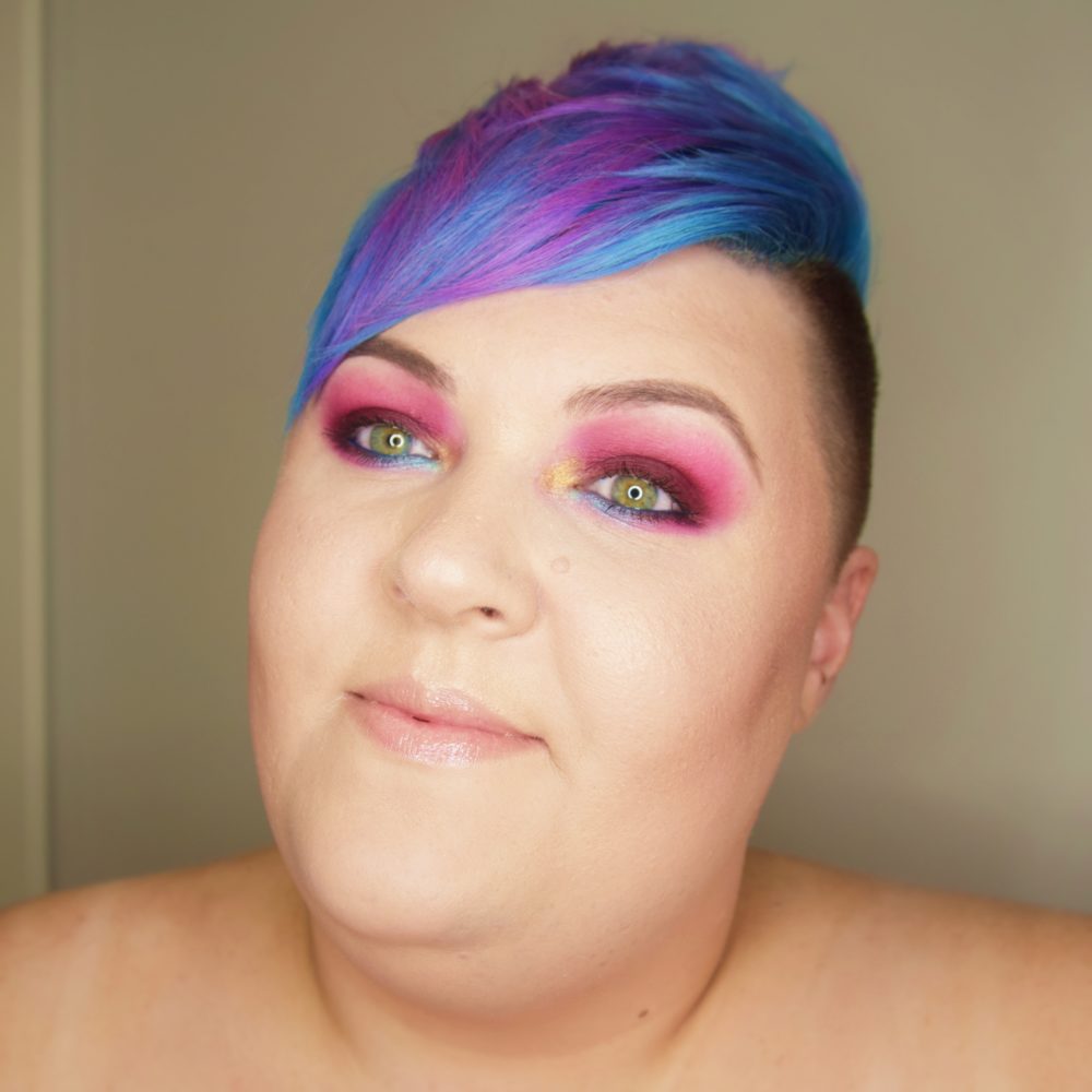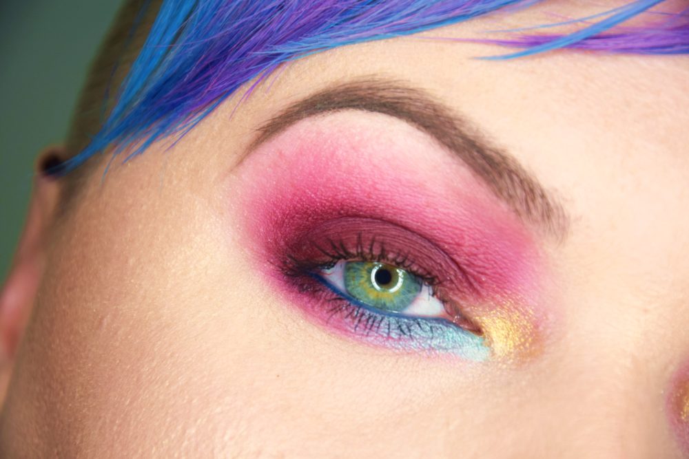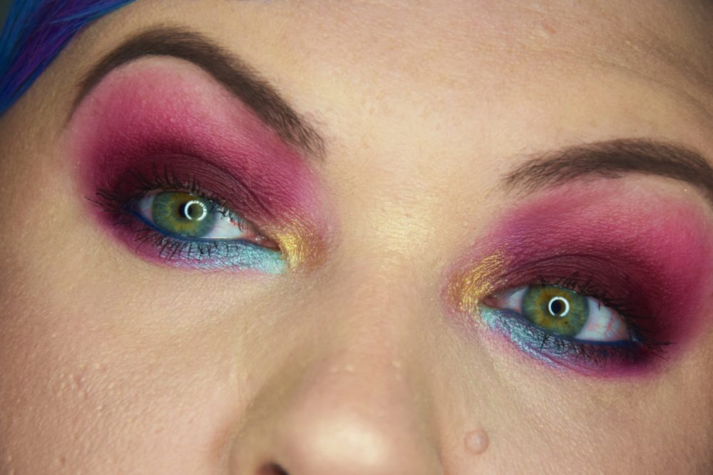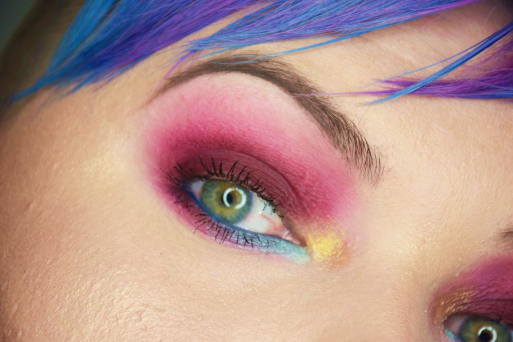 Jako podkład pod późniejsze rozcieranie w załamaniu powieki aplikuje rozproszoną chmurę różu (Juvia’s Place The Masquerade Palette: Bori). Na całą powiekę ruchomą nakładam matowy burgund (MORPHE x Jaclyn Hill Bling Boss Palette: Rockstar), a następnie rozcieram go ku górze o dwa tony jaśniejszym odcieniem (Juvia’s Place The Masquerade Palette: Zobo). Całą procedurę dokładania kolejnych odcieni i ich rozcierania powtarzam do czasu aż uzyskam zadowalające mocne rozdymienie. Dolną powiekę traktuje tak samo burgundem i rozcieram od dołu różem. Od wewnętrznego kącika do mniej więcej połowy dolnej powieki nakładam metaliczny lazur (Juvia’s Place The Zulu Palette). Zaś w samym kąciku wewnętrznym ląduje żółte złoto (MORPHE x Jaclyn Hill Armed&Gorgeous Palette: Coin). Na linię wodną ląduje ciemna, turkusowa kredka (Essence Gel Eye Pencil 04 Blue Lagoon).