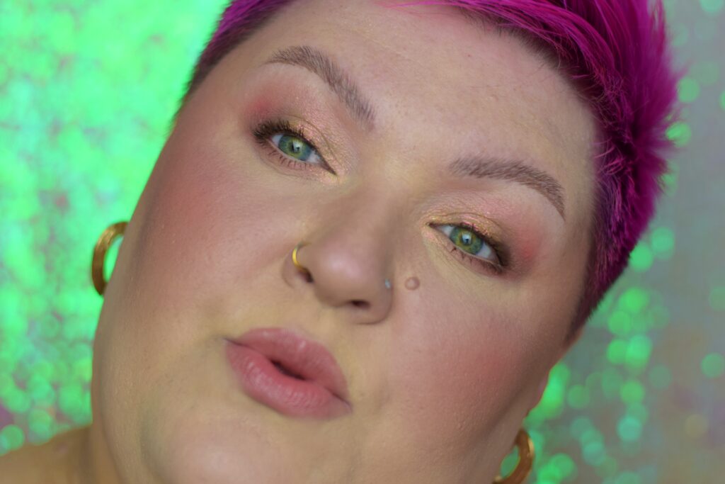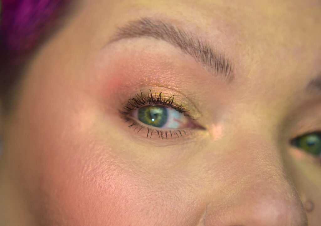 - Na całą powiekę ruchomą palcem aplikuję multichrom, który opalizuje na złoto, brzoskwinię, róż i morelę [Glaminatrix Rich Romantic #Charming];