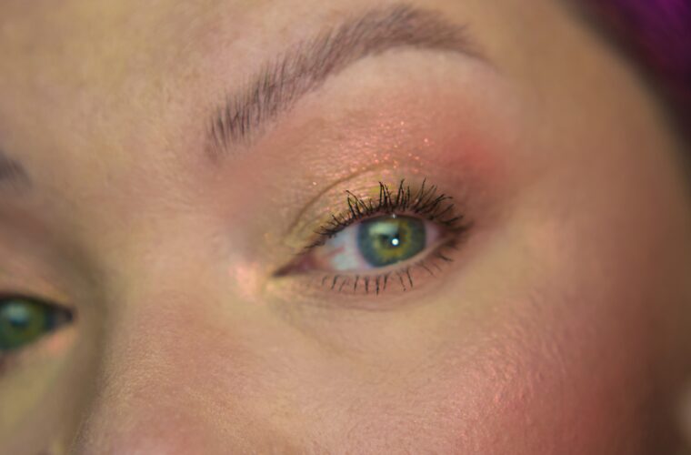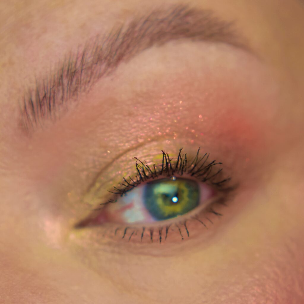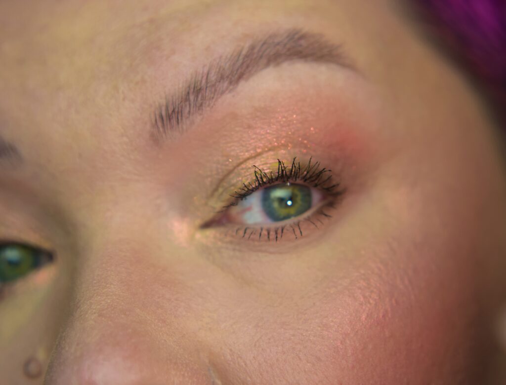 - Wewnętrzny kącik dodatkowo rozświetlam opalizującym odcieniem złota i brzoskwini [Glaminatrix Rich Romantic #Romantic].