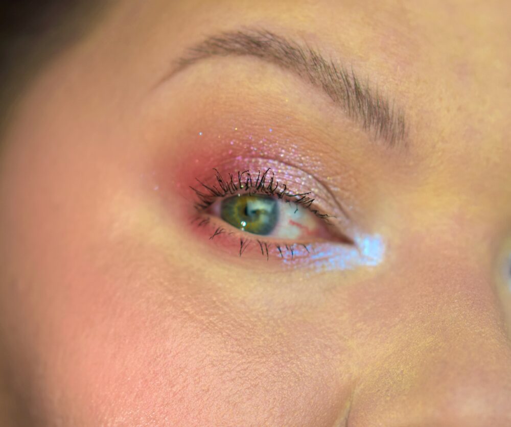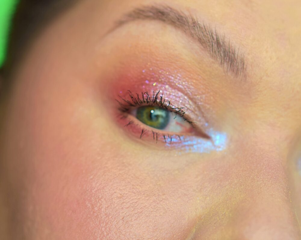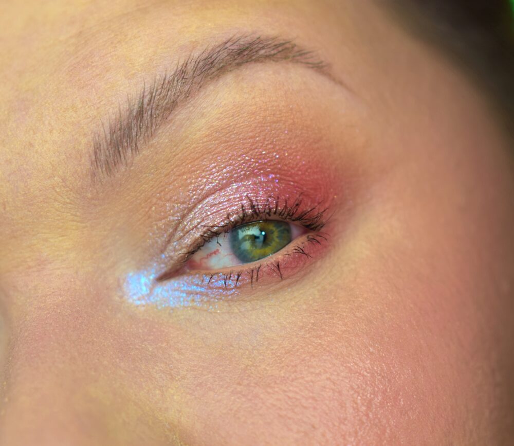- Ruchomą część powieki pokryłam rose gold/antycznym różem z milionem różnokolorowych drobinek [GlamShop Niezapominajka #Konwaliowy];