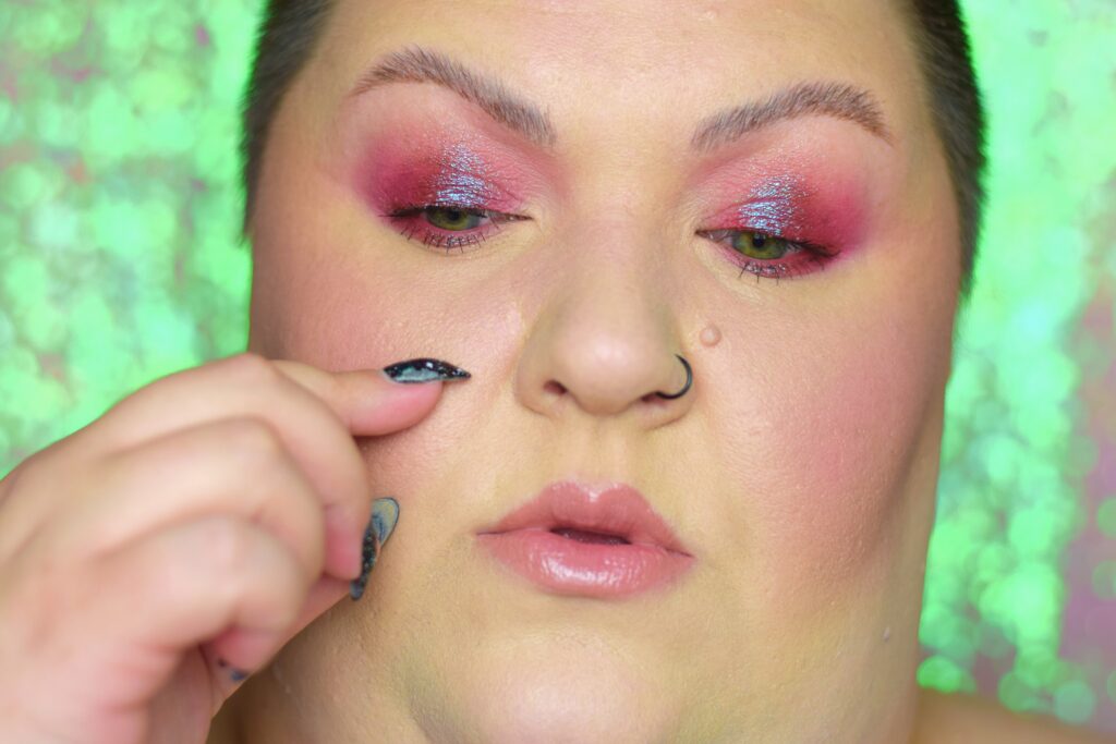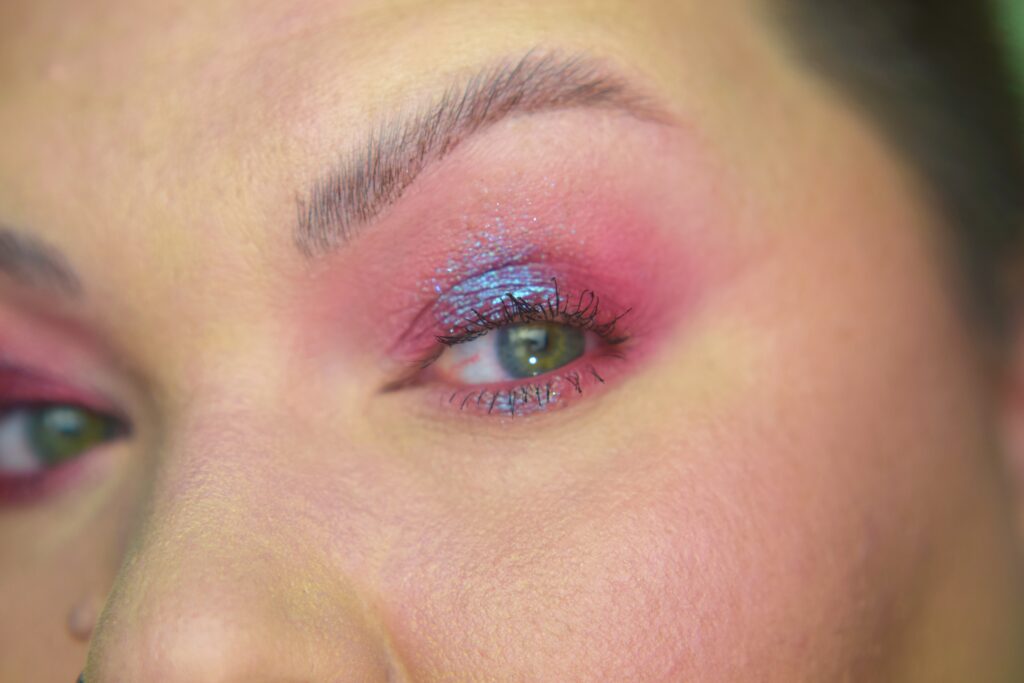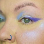 - Na środek powieki ląduje połyskujący błękit na bordowej bazie nałożony na wysokości źrenicy;