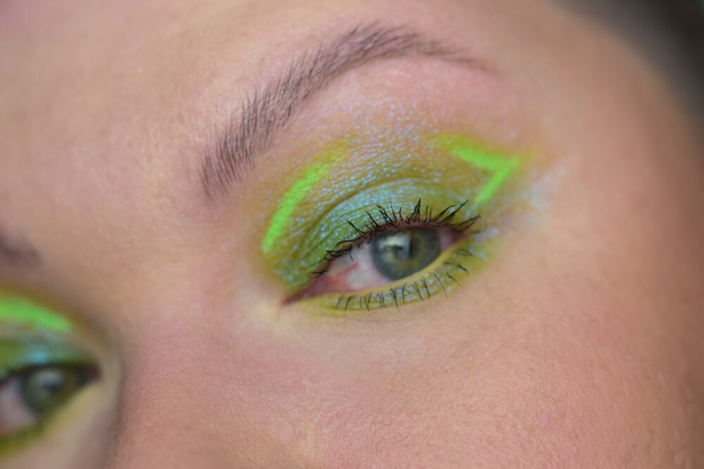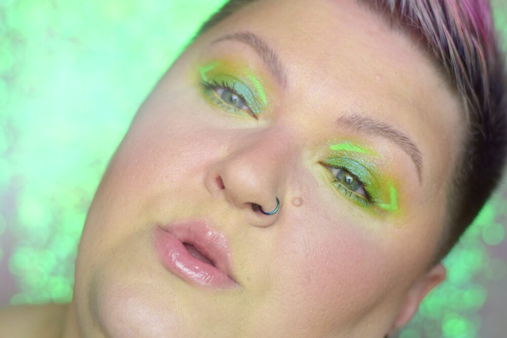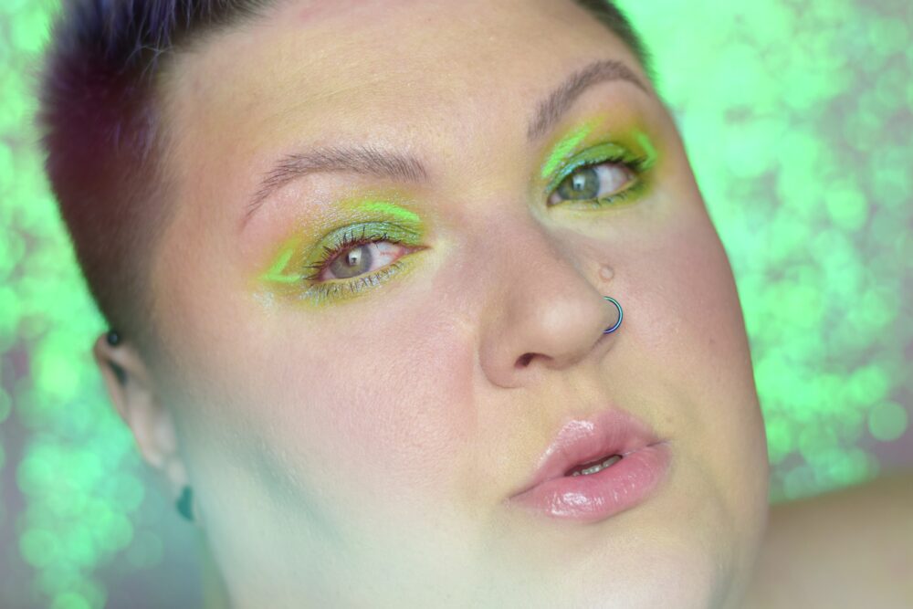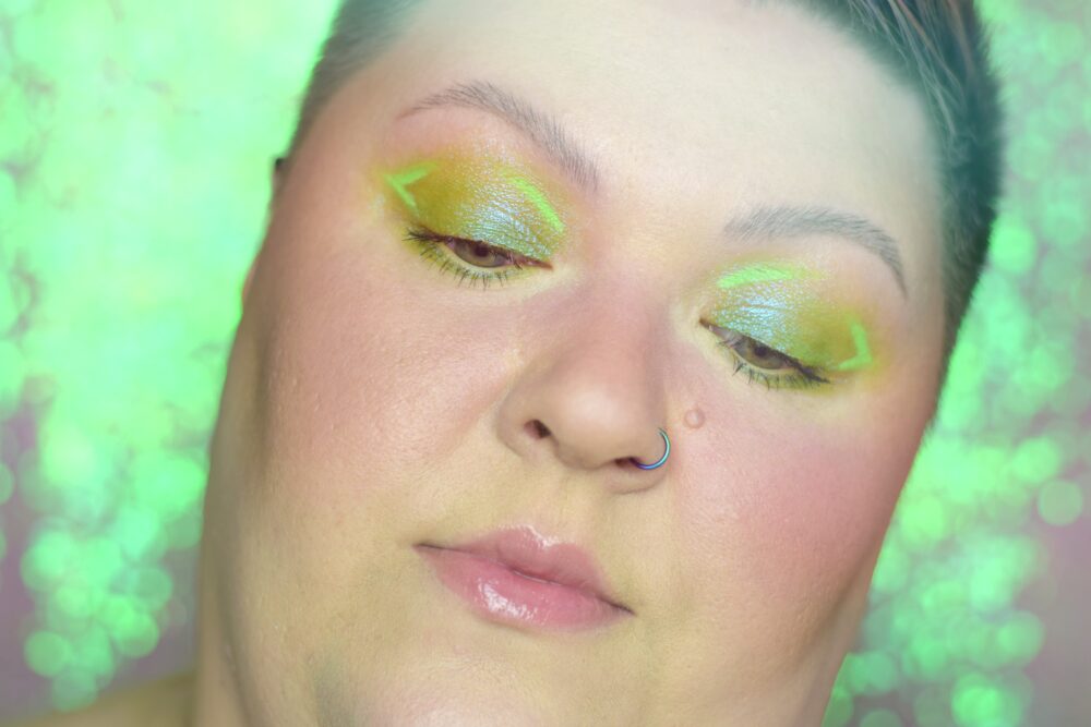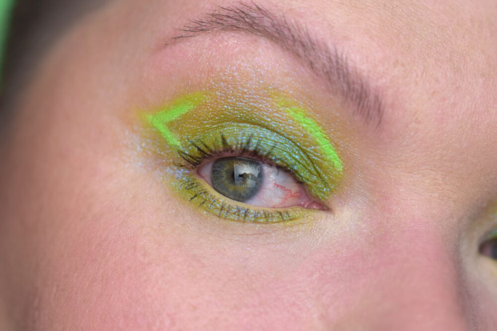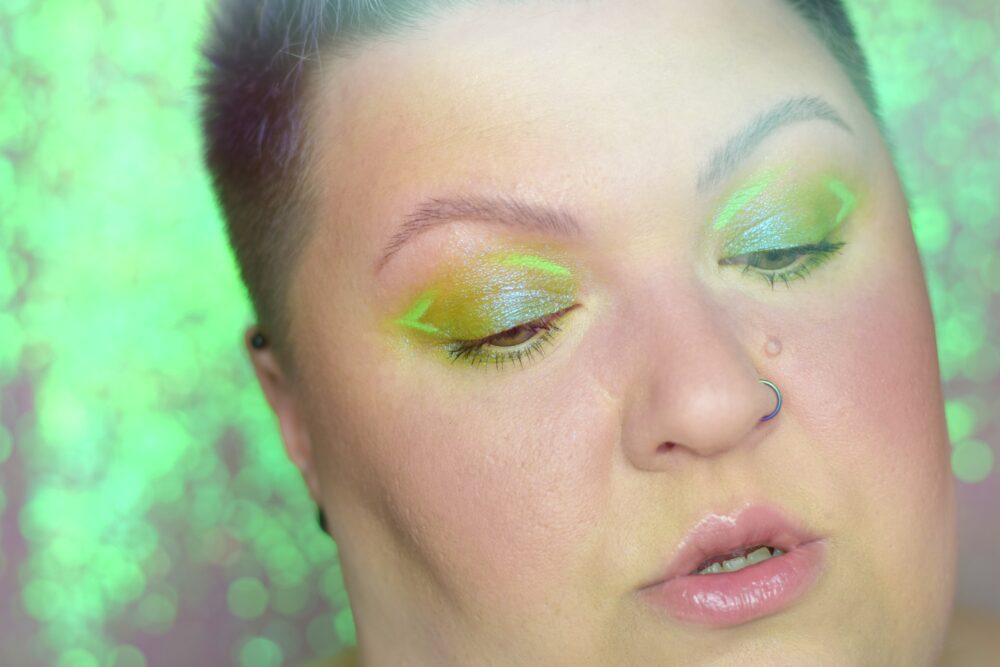 W najnowszej palecie GlamShop Słodko-Kwaśna jest neonowa zieleń KWAŚNY. Bardzo chciałam wykorzystać ten odcień właśnie w graficznych kreskach, ale… sama formuła tego cienia bardzo to utrudnia. KWAŚNY jest suchy, kredowy i bardzo lotny. Moje pierwsze próby wykorzystania go w makijażu skończyły się… jego zmyciem!