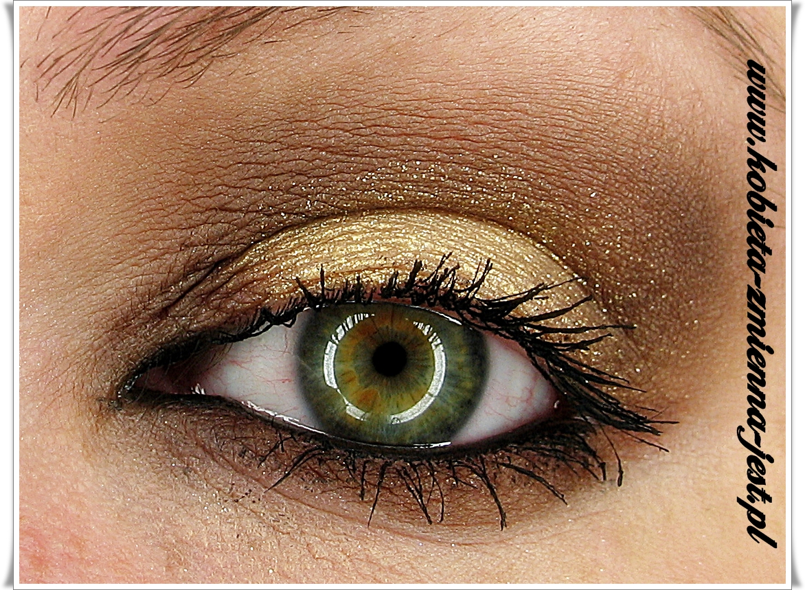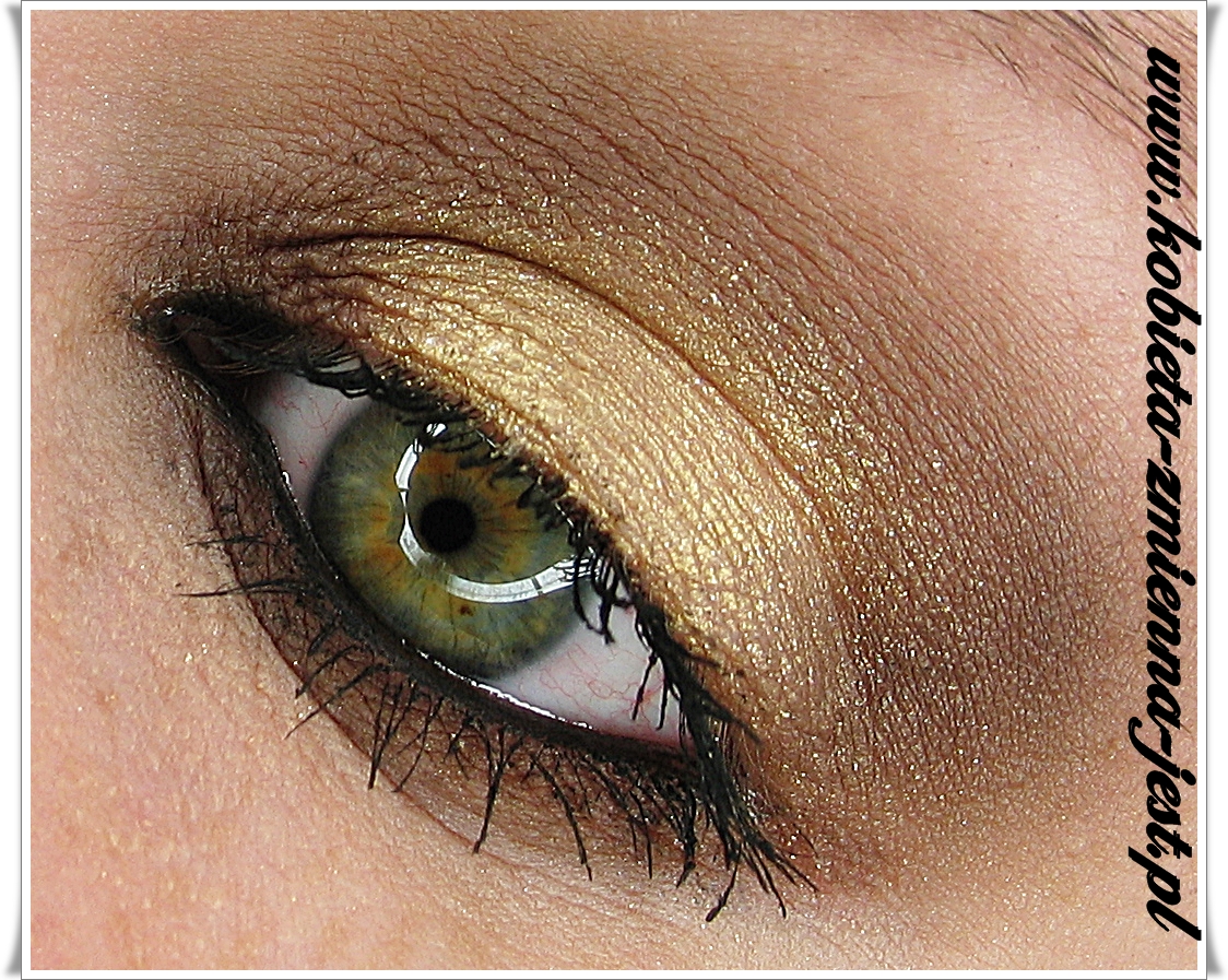 Na środek powieki nakładam złoto (Inglot 103 AMC Shine). Następnie sięgam po matowy brąz (paletka Sleek Ultra Mattes V2 DARKS, cień Paper Bag) i cieniuje nim załamanie powieki, zewnętrzny i wewnętrzny kącik oka oraz dolną powiekę. Cieniując zewnętrzną część oka wyciągam cień w kierunku końcówki brwi. Aby uzyskać efektu dymu dodaje brązu w zimnej tonacji (Inglot 376 M). Aby uzyskać większy błysk na środek powieki, palcem nakładam dodatkowo złoto z iskrzącymi drobinkami (Catrice Absolute Eye Colour Mono #420 Talk Like An Egyptian).