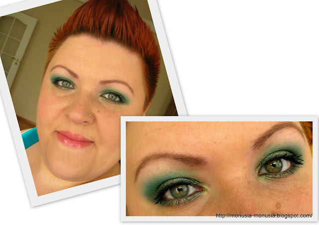 Hmm, a mnie się właśnie podoba ta zieleń chłodnawa w załamaniu, wygląda oryginalnie i robi ładny kontrast dla reszty tych ciepłych zieleni. I fajnie całość wygląda przy zielonej tęczówce, no nie rozumiem jak się zielonookie panny mogą wystrzegać zieleni ;>