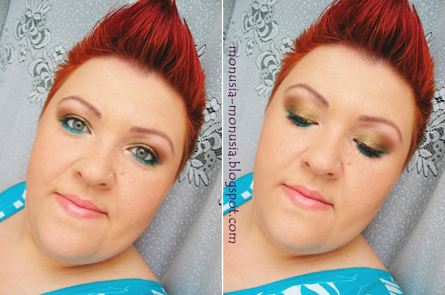 Podoba mi się to połączenie kolorów, ale coś mi w tym makijażu brakuje.. może czarnej kreski na górnej powiece albo podkreślonego załamania powieki, nie wiem:)