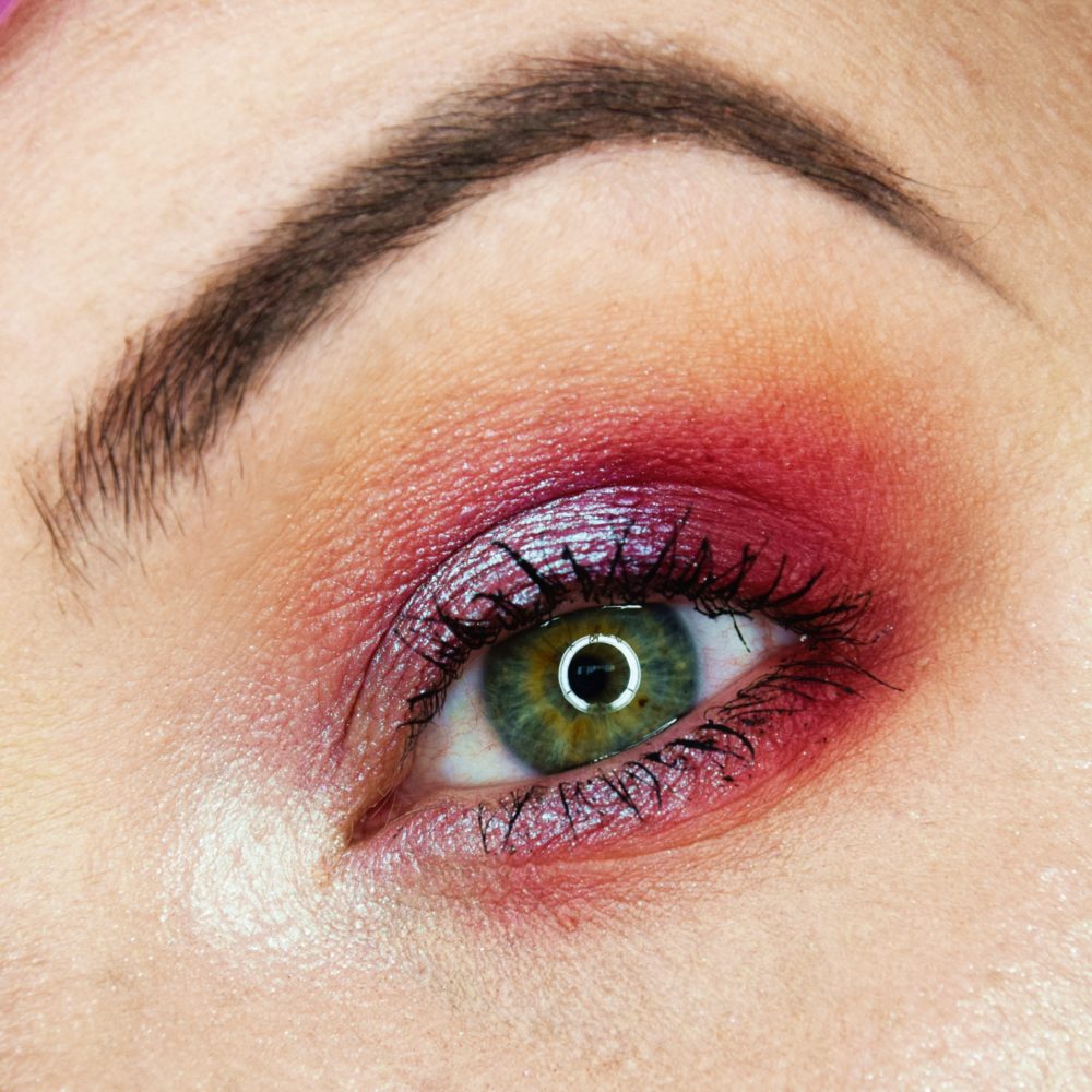 Sięgam najpierw po paletę KOBO Over The Rainbow. Nią wykonturuję oko. W załamaniu ląduje odcień lekkiej pomarańczy (cień nr 66), a kolejno pogłębiam i wzmacniam je czerwienią (cień nr 67). Czas na bordo, które trafia na zewnętrzny kącik. Resztę powieki ruchomej pokrywam duochromem/benzynką (cień Garden Gate z palety Nabla Soul Blooming). Podobne cieniowanie powtarzam analogicznie na dolnej powiece. Na końcu rozświetlam wewnętrzny kącik (cień Philosophy z palety Nabla Soul Blooming).